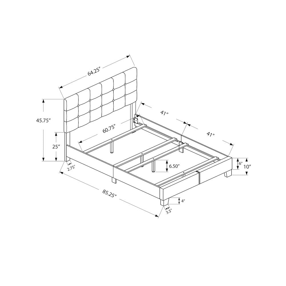 Create a sanctuary with fashionable style in your bedroom starting with this chic and trendy queen size bed frame in a light grey boucle fabric and plastic, black block feet. This transitional style upholstered bed is designed with a classic, button-tufted padded headboard where you can lean back for comfortable support. The sturdy construction of the low profile, solid engineered wood frame and wooden slats to support a standard queen size box spring and mattress (not included) ensures long-lasting durability. Easy to assemble with illustrated instructions included and all required parts and hardware are found inside the back of the headboard for convenience. Backed by a 2 year limited warranty against manufacturer defects, this quality made bed frame is the perfect addition fashion-forward bedrooms with a cozy style. Please note a box spring is required (not included) for additional support, mattress not included. This bed is for the frame only.