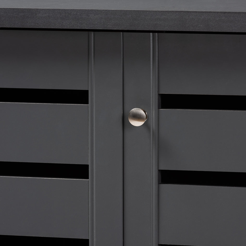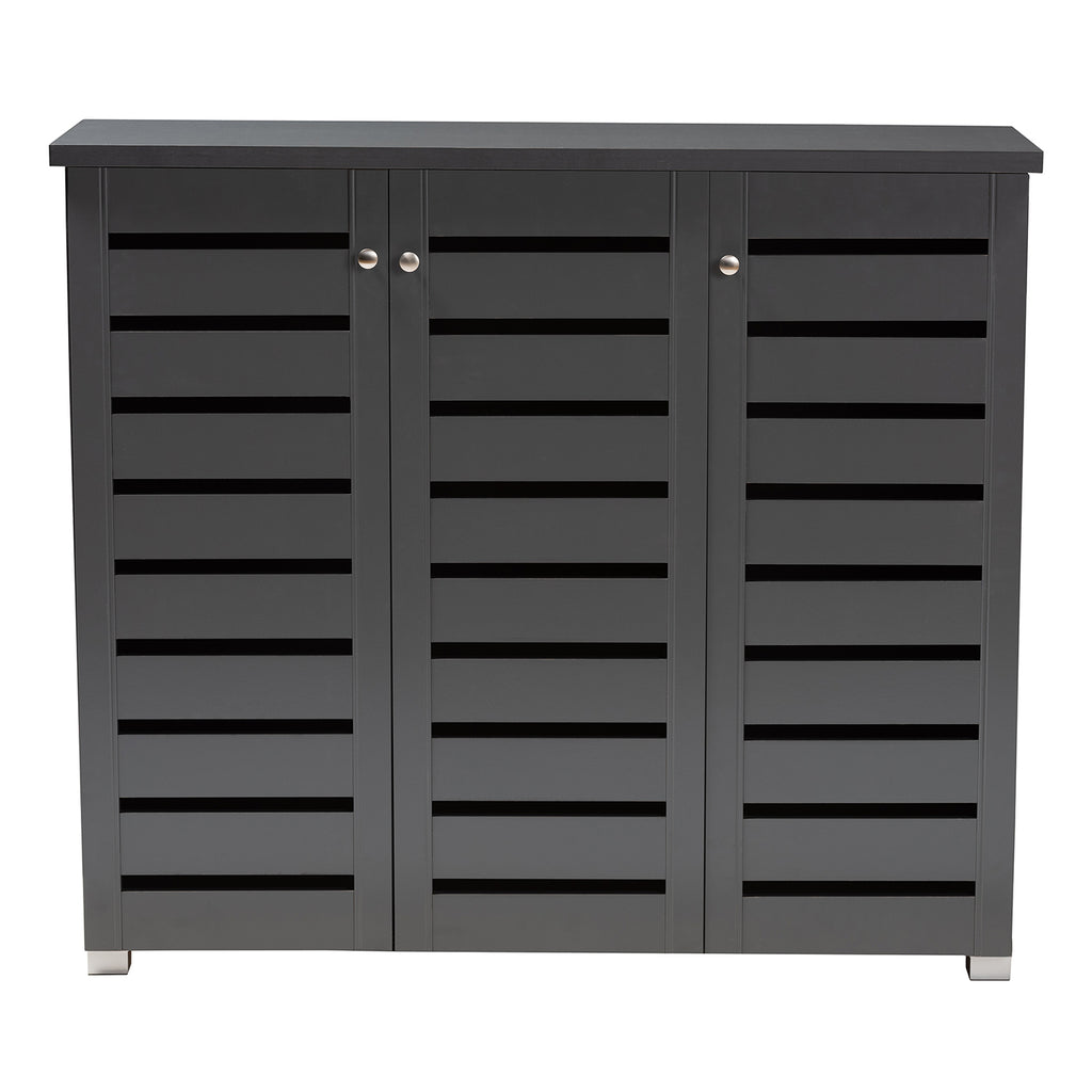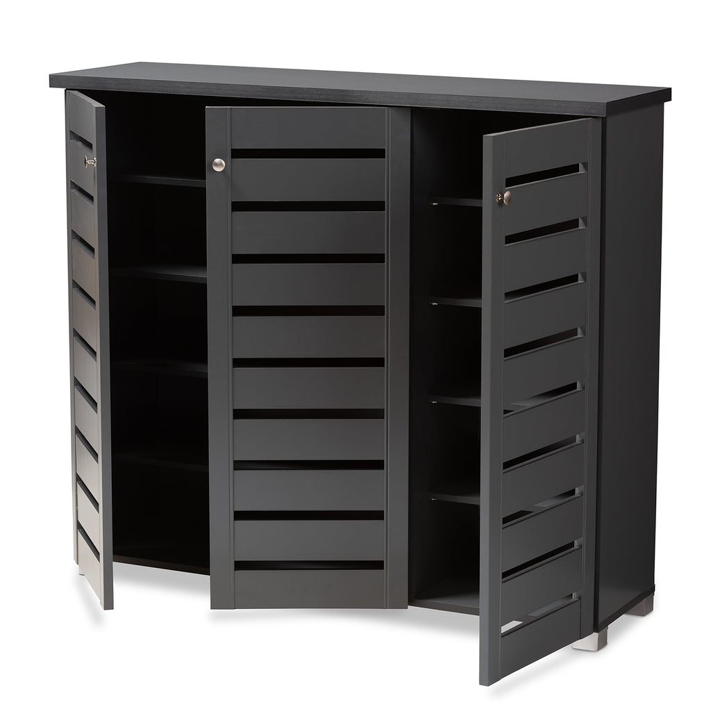 Shoe organization is made easy with the Adalwin cabinet. Featuring a stylish contemporary design and dark grey finish, the Adalwin is easy to coordinate with any style of decor. Three doors conceal ten fixed shelves with storage space for up to 20 pairs of shoes. The doors feature open slats to enable air circulation and prevent mold growth on your shoes. The Adalwin cabinet is made in and requires assembly.