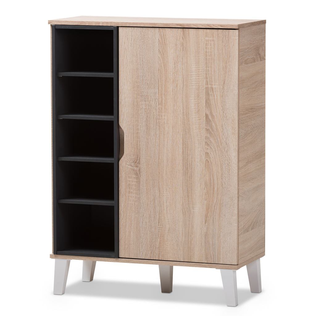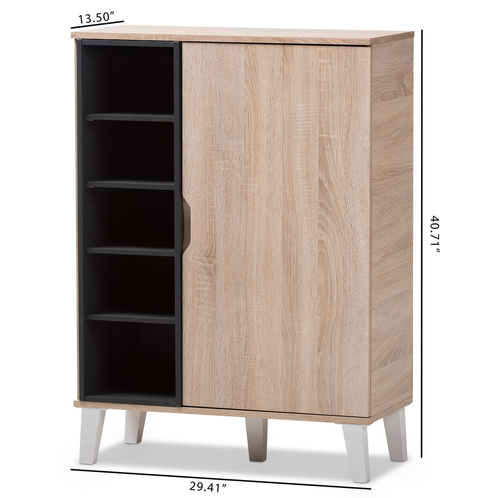 Opt for maximum storage space to organize your shoes with the ample shelving of the Adelina shoe cabinet. Constructed of engineered wood for a durable and sturdy structure that is easy to maintain, the Adelina features a generous amount of storage space, with five open shelves and five closed shelves behind the door to store and organize your shoes. Cabinet door is on metal hinges and with cut-out handle for easy access. A combination of oak and dark grey two-tone finishing imbues modern minimalism setting. Made in , the Adelina shoe cabinet requires assembly.