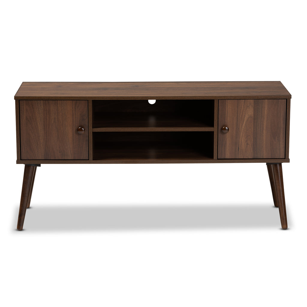 Create a retro vibe in your living space with the Alard TV stand. Constructed from wood, the Alard features a classic walnut brown finish that complements its vintage-inspired design. Two shelves provide space to store DVD players, game consoles, and more. The top shelf is fitted with a cord management hole to enable easy concealment of cables and wires. Additional storage space is provided by two shelves concealed by doors. Round knobs and angled, tapered legs add a charming mid-century look. The Alard TV stand is made in and requires assembly.