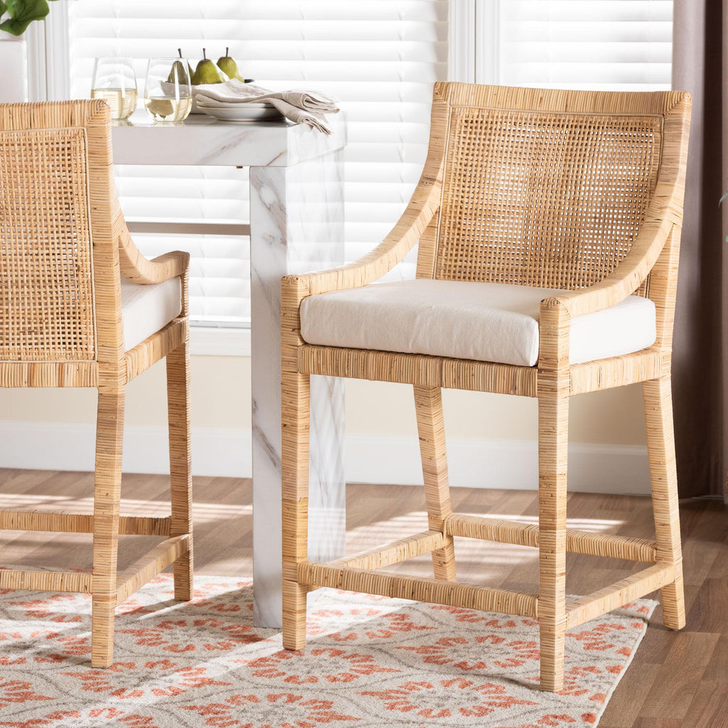 Relish in an atmosphere of rustic serenity with the lovely Alexis counter stool. Made in Indonesia, this bohemian piece consists of a solid acacia wood frame wrapped in sustainably sourced natural rattan. The lattice backrest lends an airy, breezy display while the sloping outline creates a tranquil silhouette from any angle. The Alexis will arrive fully assembled and is fitted with an ergonomic footrest to offer enhanced leisure. Expressing the poise of paradise, the Alexis counter stool uplifts any setting.