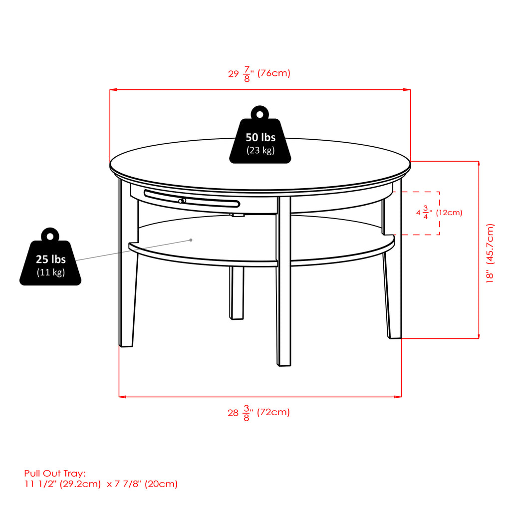 Amelia Occasional Table Collection has ample storage and usable space with pull out tray and a shelf. Complete your home with both Round Coffee Table and End Table. Constructed with combination of solid and composite wood in dark espresso finish. This Coffee Table is 29.9"W x 29.9"D x 18"H overall assembled size with shelf diameter is 24.8". Pull out tray is completely removable if desired and tray surface is 11.4"W x 13.9"D with option of stopper tray will pull out 11". Shelf has a clearance of 4.73" and the ground clearance to shelf is 9.9". Assembly required.