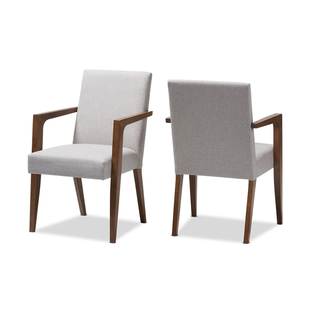 With character and style, the Andrea wooden armchair brings distinct edges to the modern home. Featuring timeless and intuitiveversatile, the Andrea is constructed of solid wood frame for Upholstered in greyish beige polyester fabric, the back and seat cushions are foam-filled to provide and support. The legs and armrests in walnut finishing, built geometrically, blending in aesthetic while lending support and Sturdiconstructed, the Andrea armchair looks great from all angles, whether in a lounge arrangement, public waiting area or private office. the Andrea accent chair will be a standout piece in any modern interior.