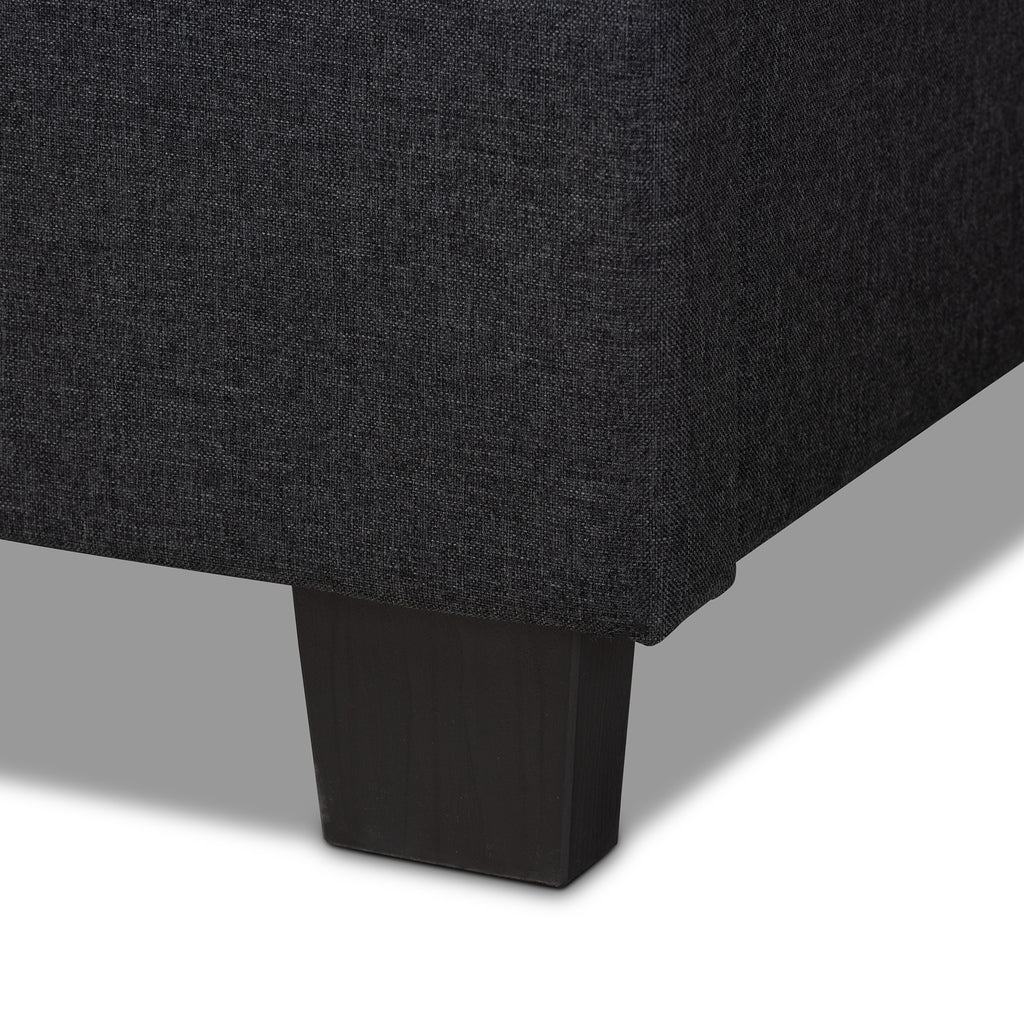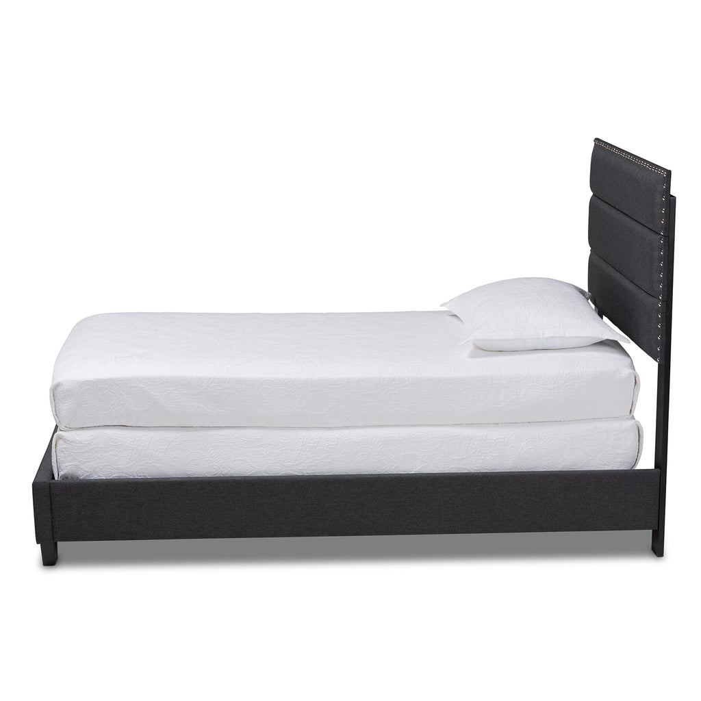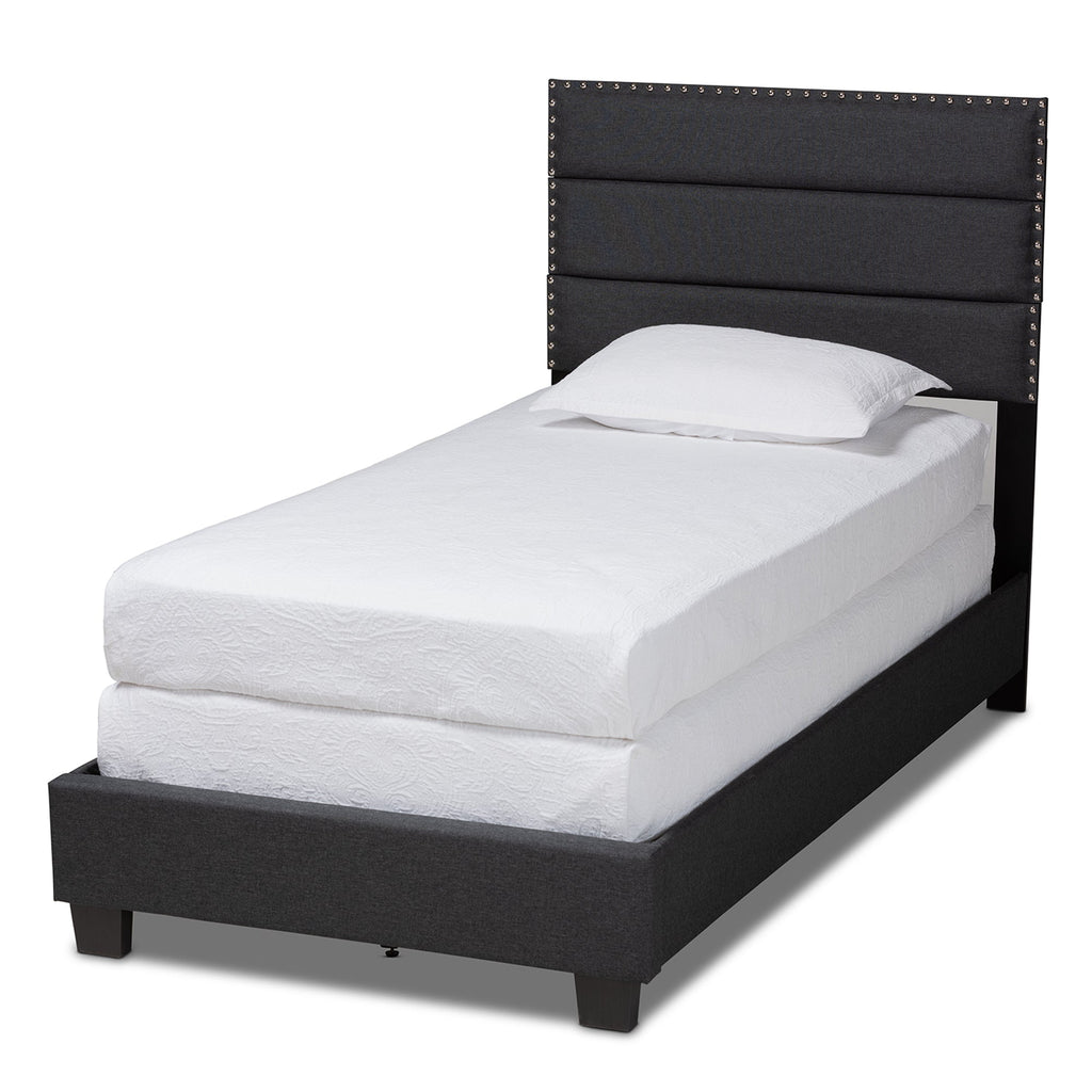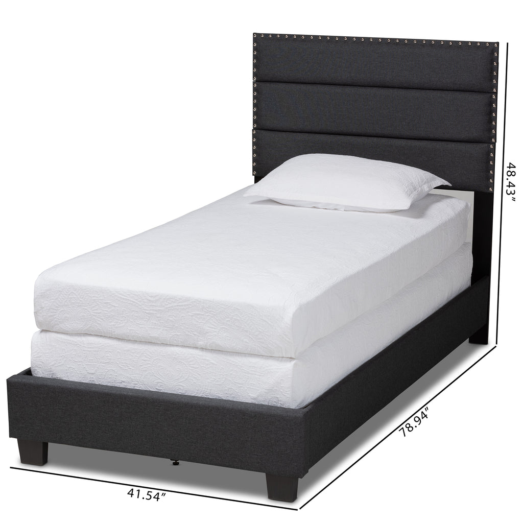 With the Ansa bed. Built with a sturdy wood frame, the Ansa is upholstered in a soft, foam filled polyester fabric that provides ample for you to rest against. Channel tufting adds a clean, modern look, while silver nailheads. Black tapered legs complete the look. A box spring is required for use.