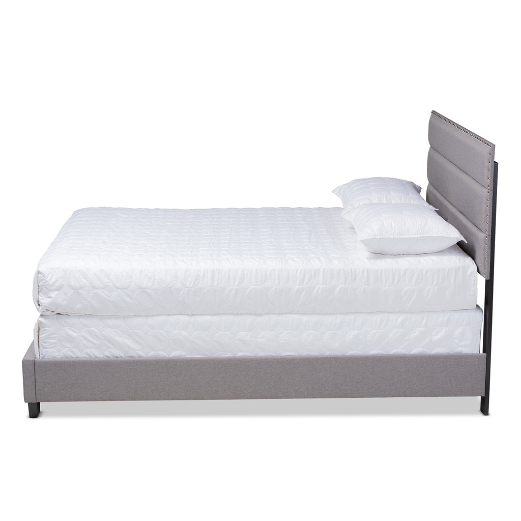 With the Ansa bed. Built with a sturdy wood frame, the Ansa is upholstered in a soft, foam filled polyester fabric. Channel tufting adds a clean, modern look, silver nailheads. Black tapered legs complete the look. A box spring is required for use. The Ansa bed requires assembly.