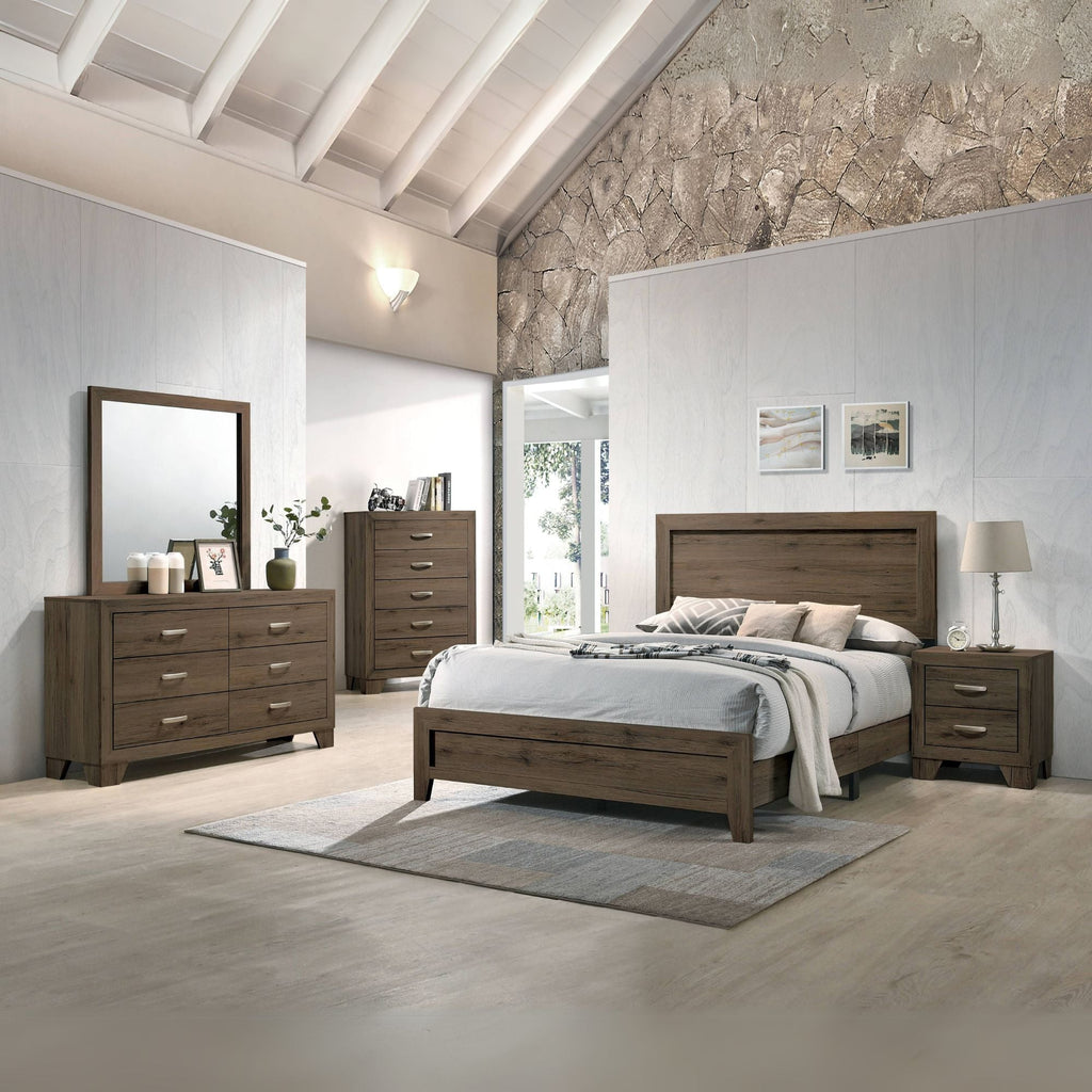 The Miquell bedroom collection provides a commanding presence in any bedroom. This contemporary panel bed features a rectangular headboard with a low profile footboard and tapered legs. All expertly crafted with a transitional look that is an ideal addition to any bedroom. This fashionable bed will fuse with the surrounding decor and accent your other bedroom furniture, transforming a room from ordinary into something interesting and sophisticated.