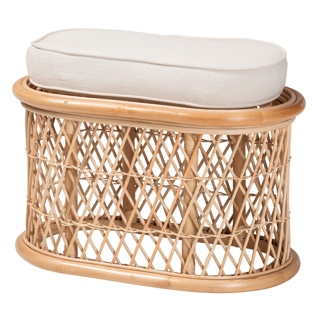 Nurture a carefree attitude in your space with the rustic serenity of the Ladonna ottoman. Made in Indonesia, this bohemian piece is handcrafted from natural rattan and is topped with a removable fabric upholstered cushion. The oval silhouette is adorned with rattan pole, creating a stunning openwork display from any angle. The Ladonna ottoman will arrive fully assembled and serves as a fantastic footstool or extra seating as needed. Radiating exotic grace from a petite form, the Ladonna ottoman is a fantastic complement to any arrangement.