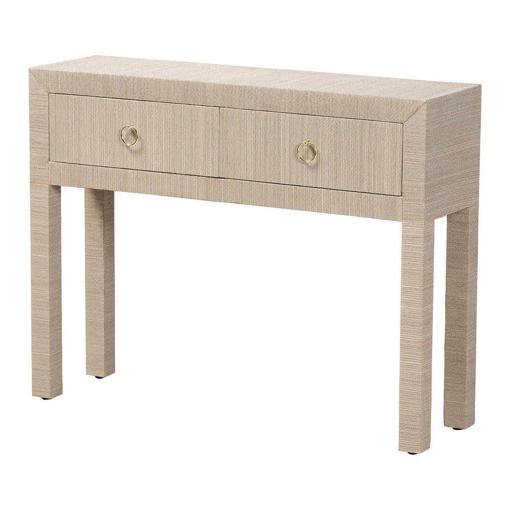Embolden the graceful ambiance of your home with the fantastic Noah console table. Made in Indonesia, this bohemian piece consists of a sturdy wood frame intricately adorned with handwoven grasscloth. Two drawers offer secure storage to organize and declutter household essentials while reserving the wide tabletop as a fantastic display area. The Noah will arrive fully assembled and is fitted with graceful metal ring pulls for a touch of luxury. With a streamlined silhouette that highlights the unique material, the Noah console table is an invigorating accessory for any interior.