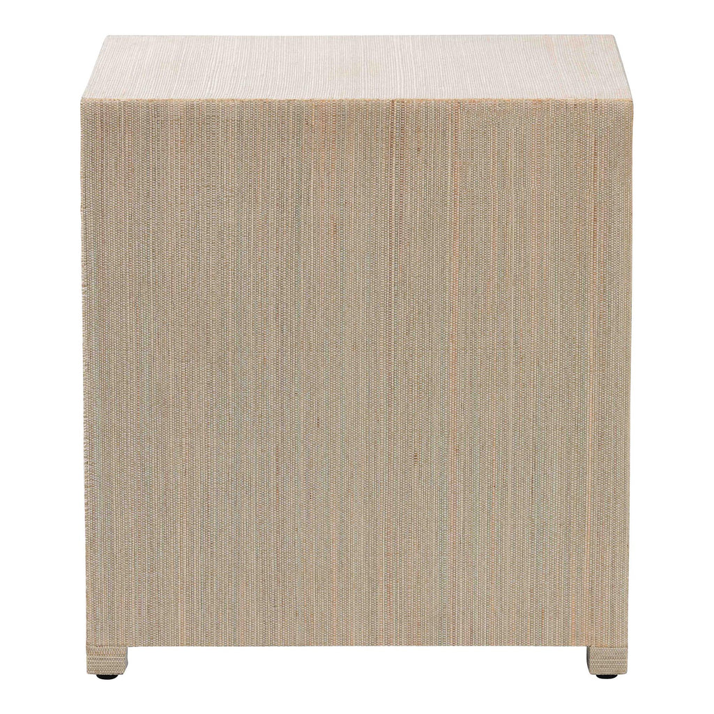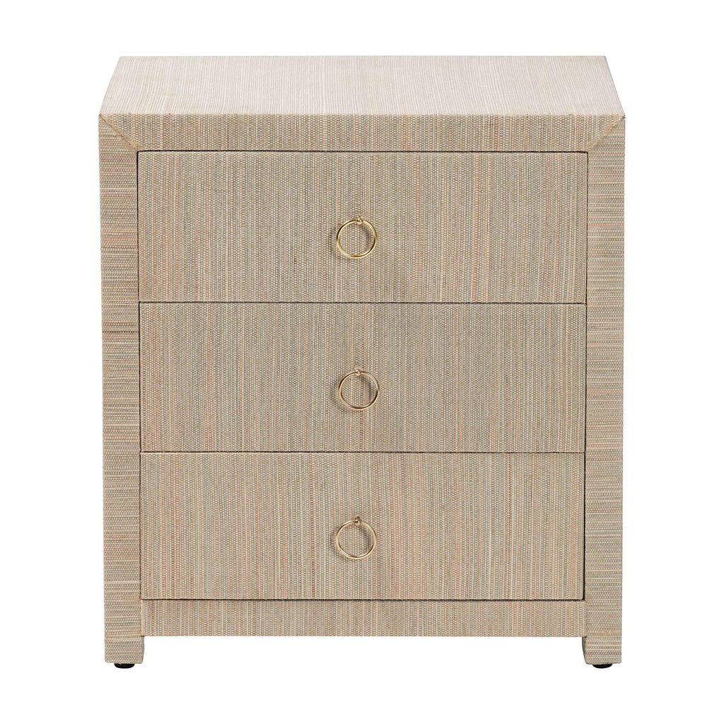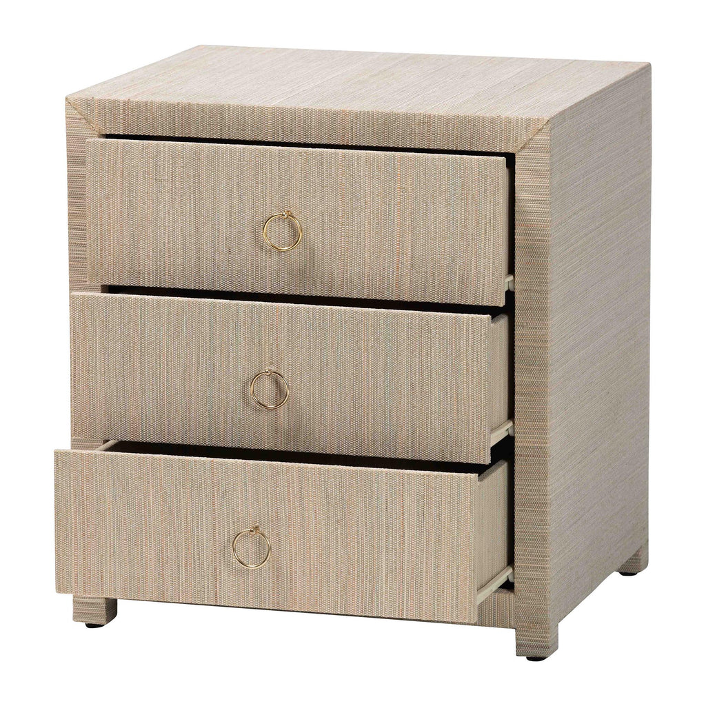 The beauty of the natural world arrives at your bedside with the lovely Quinn nightstand. Meticulously handcrafted by skilled Indonesian artisans, this bohemian piece consists of a sturdy wood frame beautifully embellished with woven natural grasscloth. Three drawers offer easy storage for all your nighttime essentials while reserving the tabletop for daily use. The Quinn will arrive fully assembled and features ring pulls that stand out brilliantly against the woven drawers. With a modest yet vigorous look, the Quinn nightstand elevates any bedroom.