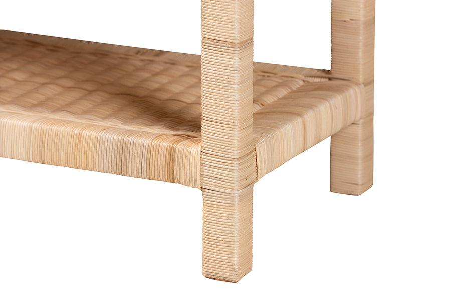 Rethink the potential of your space with the versatile and charming Weyman end table. this bohemian piece is handcrafted from sustainabsourced natural rattan. This ergonomic piece features a removable tray-style tabletop for hosting casual get-togethers with friends and family. The Weyman will arrive fulassembled and features an open shelf to provide extra storage space. With scalloped detailing lending an enchanting display, the Weyman end table is a wonderful household accessory.