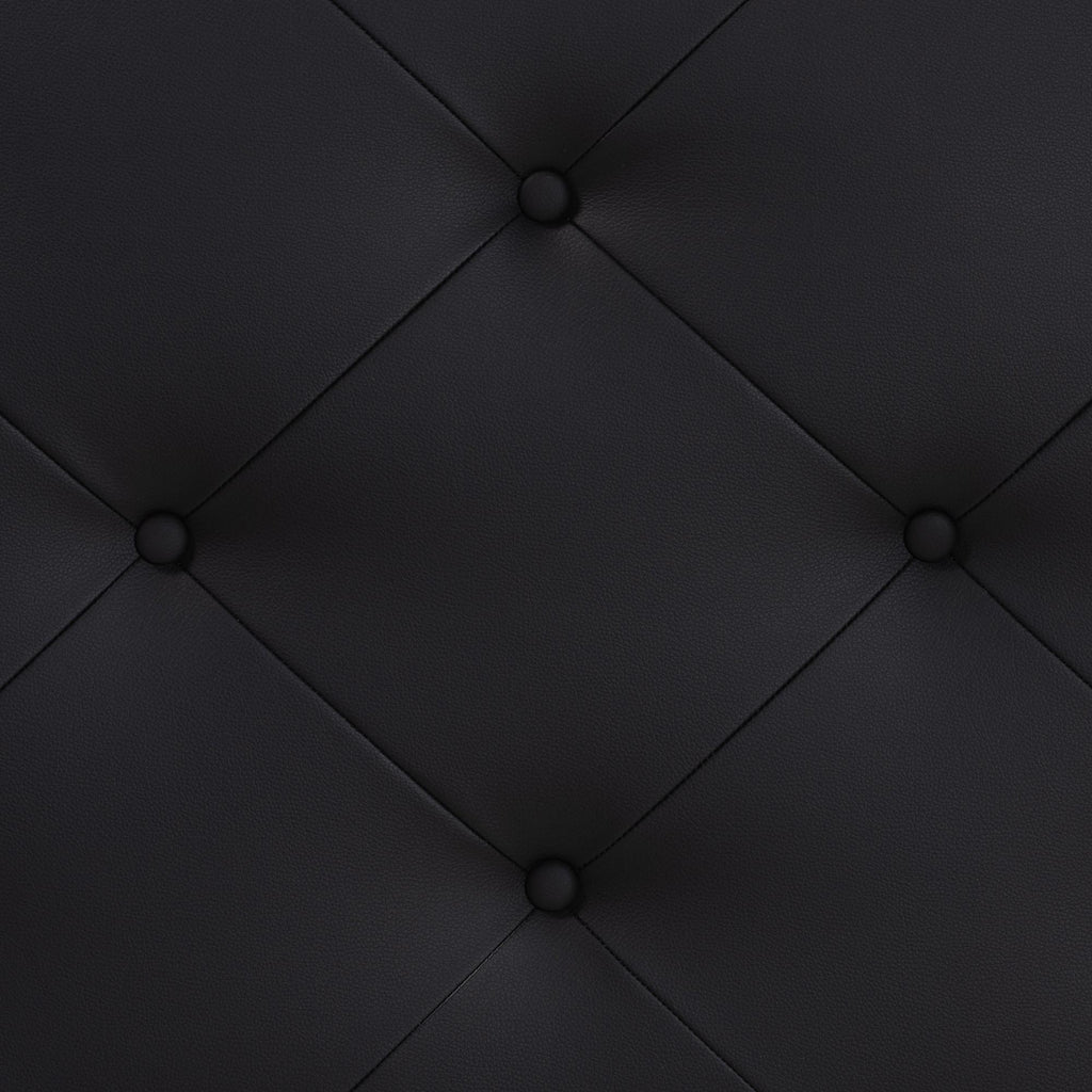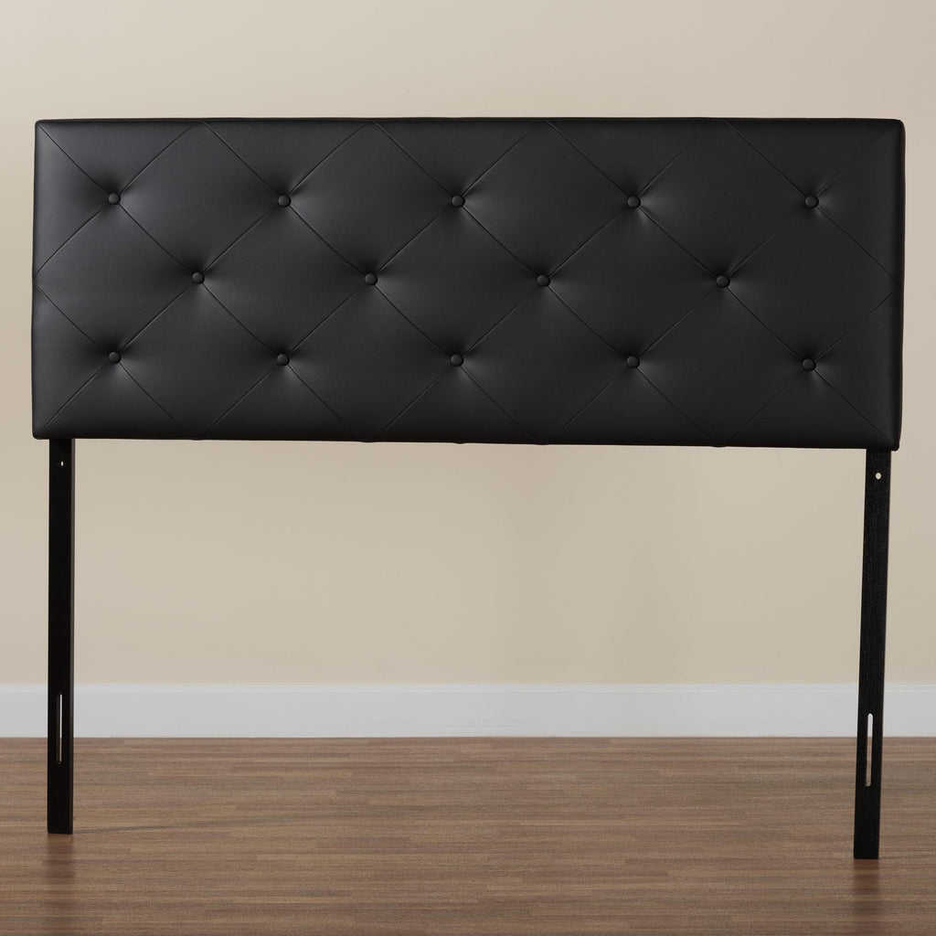 Bored with your bedroom. Need to perk up that platform bed? Add the look of leather. Our king size black faux leather headboard boasts button-tufted distinction that contrasts sharpwith just about any wall. Rubberwood frame with foam padding provides added The Baltimore is fully upholstered in padded faux leather. The Baltimore headboard imbues a strong sense of style, while presenting a modern piece full of boxy lines that accessorize with many looks. The headboard comes with 2 pre-drilled holes (with height from ground up of 5.5" and 8") that go with any Leggett and Platt bedframe. The upper part on the back of the headboard's legs comes with 5 predrilled holes with 2.55" apart from one another for height adjustment.