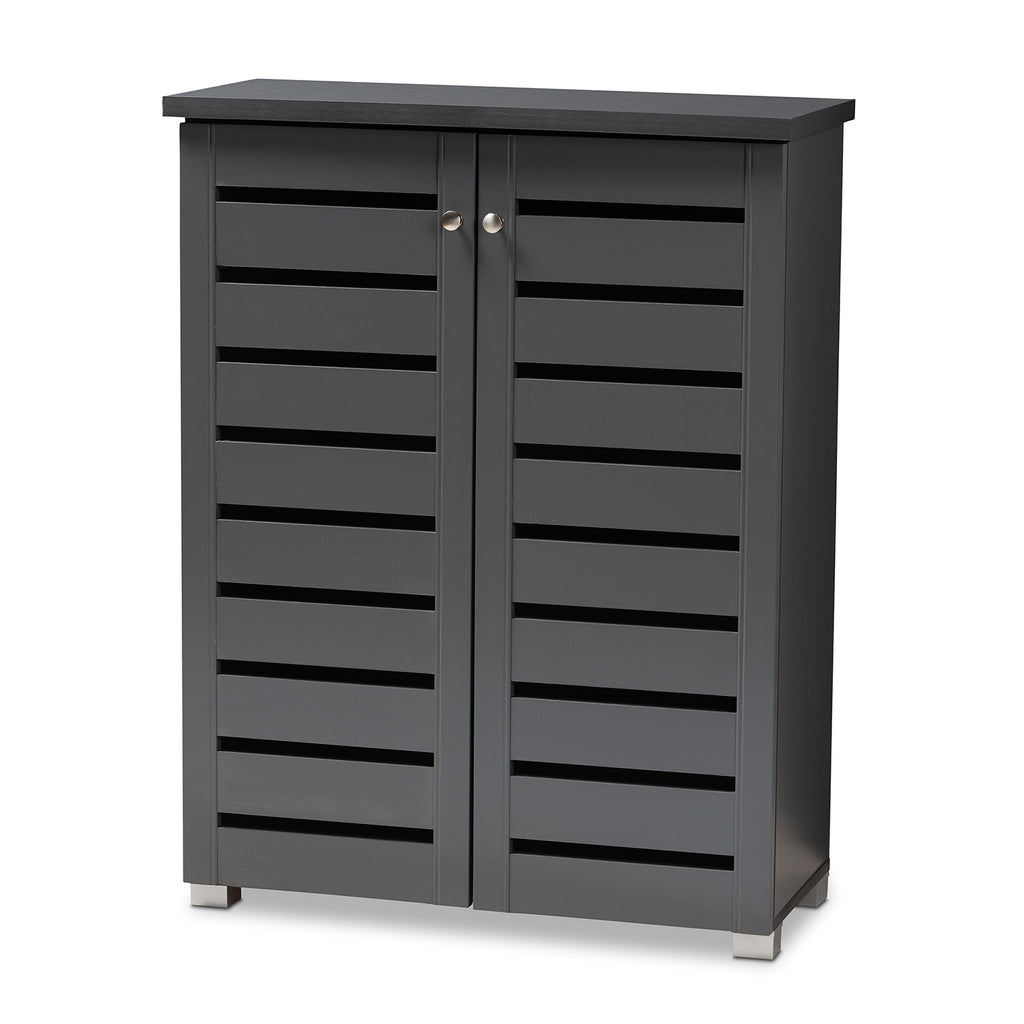 Shoe organization is made easy with the Adalwin cabinet. Featuring a stylish contemporary design and dark grey finish, the Adalwin is easy to coordinate with any style of decor. Two doors conceal four fixed shelves with storage space for up to 15 pairs of shoes. The doors feature open slats to enable air circulation and prevent mold growth on your shoes. The Adalwin cabinet is made in Malaysia and requires assembly.