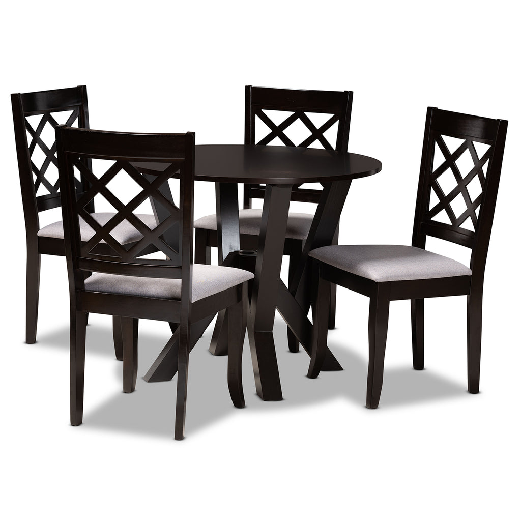 Modernize your dining room with the contemporary style of the Adina dining set. Made in Malaysia, the set includes four dining chairs and one table constructed from sturdy wood in a rich dark brown finish. Each chair is equipped with a foam padded seat that is upholstered in smooth grey fabric. Requiring assembly, the large, circular tabletop ensures plenty of elbow room for each member of the table. Saber legs add an elegant feel, making the Adina dining set a fantastic upgrade to any home.