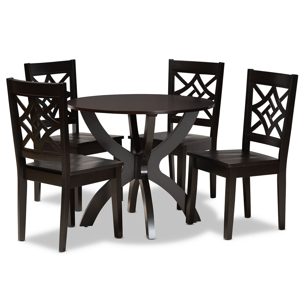 Add crisp, contemporary design to your dining space with the visually striking Anila dining set. Made in Malaysia, this wooden set includes four dining chairs and one dining table finished in a rich dark brown hue. Each chair is fitted with a smooth scoop seat for casual comfort and features a unique, geometric cut out design for enhanced visual appeal. Requiring assembly, the circular tabletop provides ample elbow room for each member of the table. Perfect for both casual and formal dining, the Anila dining set is an excellent addition to the modern home.