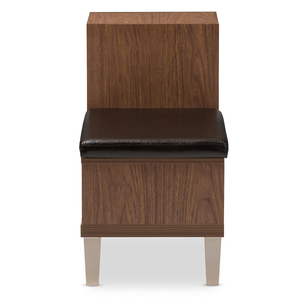 Simple and architectural, the Arielle 3-drawer shoe storage padded leatherette seating bench is reminiscent of modern and contemporary design. The Arielle’s clean and functional design features powder coated vinyl legs supporting the framework of the seating bench while providing storage drawers for hallway essentials. Three generous sized storage drawers and two open shelves are built in providing storage solution to keep your entryway or hallway clutter free. Crisp, clean lines and finger grooves drawers give the shoe bench an effortless character and charm. The shoe storage bench, constructed of engineered wood and finished in walnut finishing will match with your modern interior decor. The Arielle bench, padded in foam and upholstered in faux leather, could be placed in your living room or entryway as shoe storage bench or seating bench. Made in Malaysia, the Arielle requires assembly.