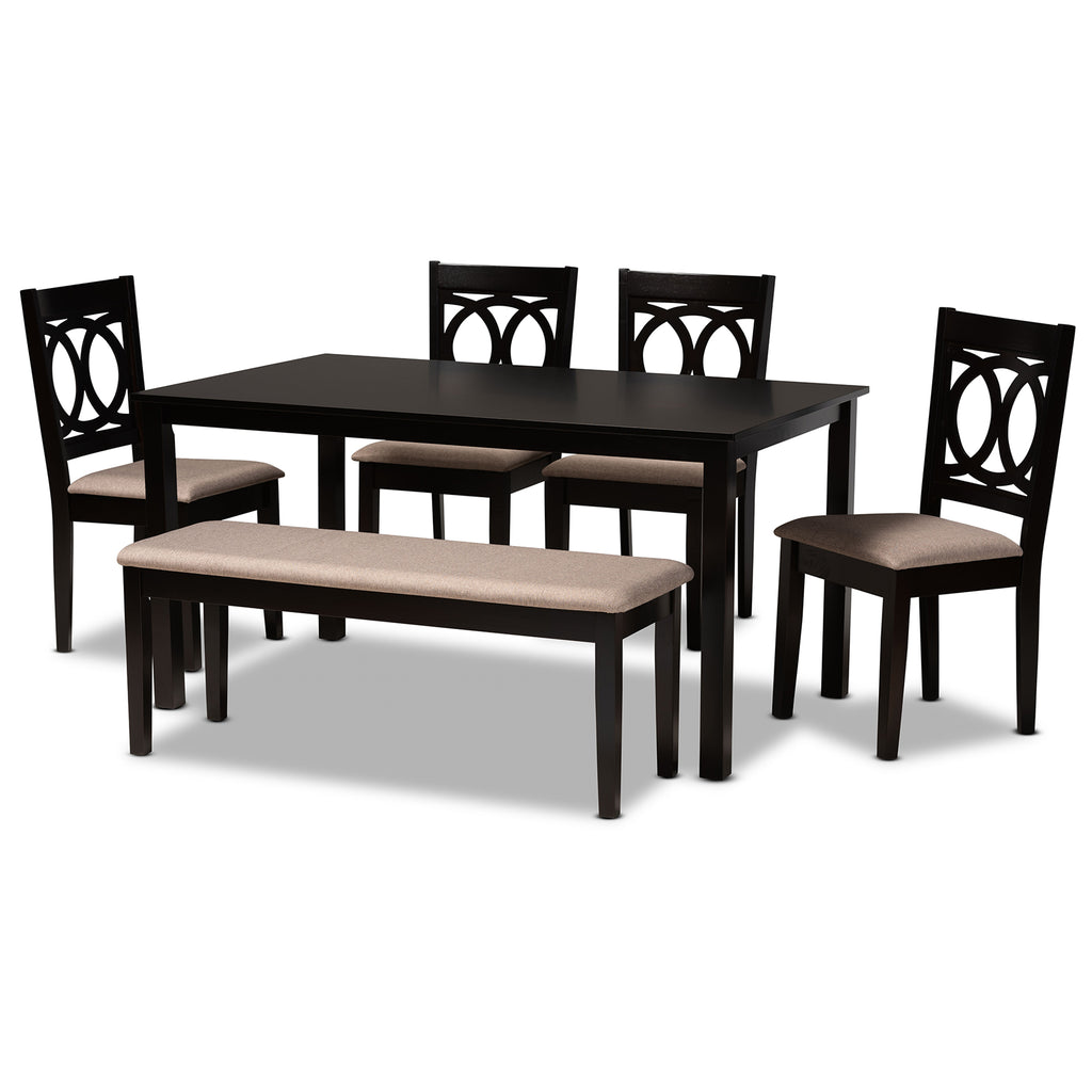 Contemporary design and superb comfort come together to create the stunning Bennett dining set. Made in Malaysia, the Bennett includes four dining chairs, one dining bench, and one table. Each seat is fitted with a foam-padded cushion upholstered in a smooth sand tone fabric for exceptional comfort. Requiring assembly, the large, rectangular tabletop allows ample elbow room for each member of the table. Perfect for both causal meals and formal dinner parties, the versatile Bennett dining set easily modernizes any dining space.