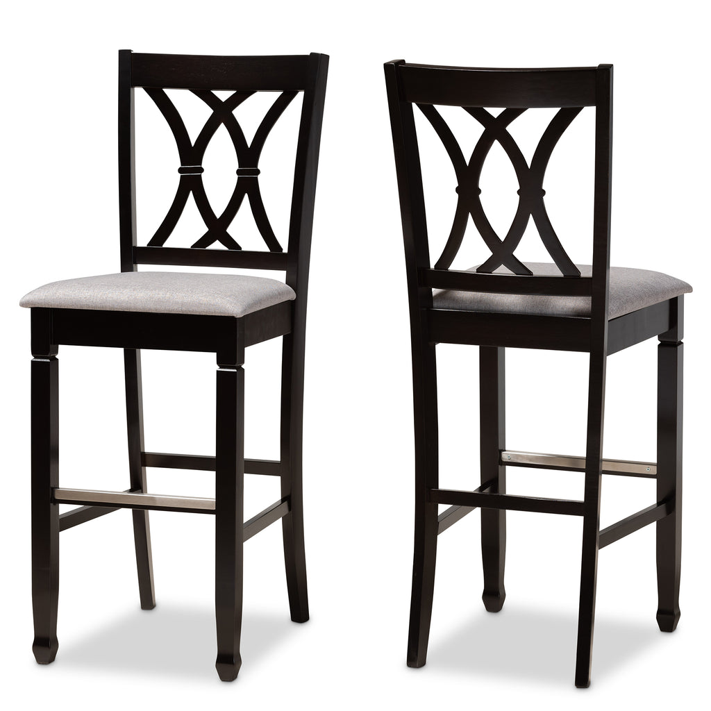 Terrific comfort dressed in modern style defines the Calista bar stool. Made in Malaysia, the Calista is constructed from wood in a classic square frame. The bar stool is fitted with a foam-padded seat underneath a soft layer of fabric and features a striking cut-out design on its back. This piece requires assembly and is finished in a rich espresso brown that complements the light tones of the fabric. Sturdy silver metal is fitted on the front footrest, making the Calista bar stool well suited for both commercial and residential settings.