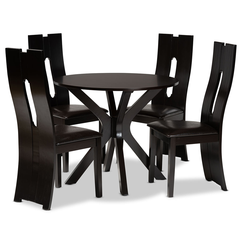A harmony of modern comfort and style, the Cian dining set adds character to any space. Made in Malaysia, the Cian is constructed from sturdy wood and includes four chairs and one table. Plush foam-padded seats covered by smooth faux leather provide a comfortable embrace while the circular tabletop allows for ample elbow room for each member of the table. Assembly is required and the darker tones of the Cian allow it to easily blend in with modern home layouts. A stylistic choice equipped with lavish comfort, the Cian dining set is an excellent addition to any home.