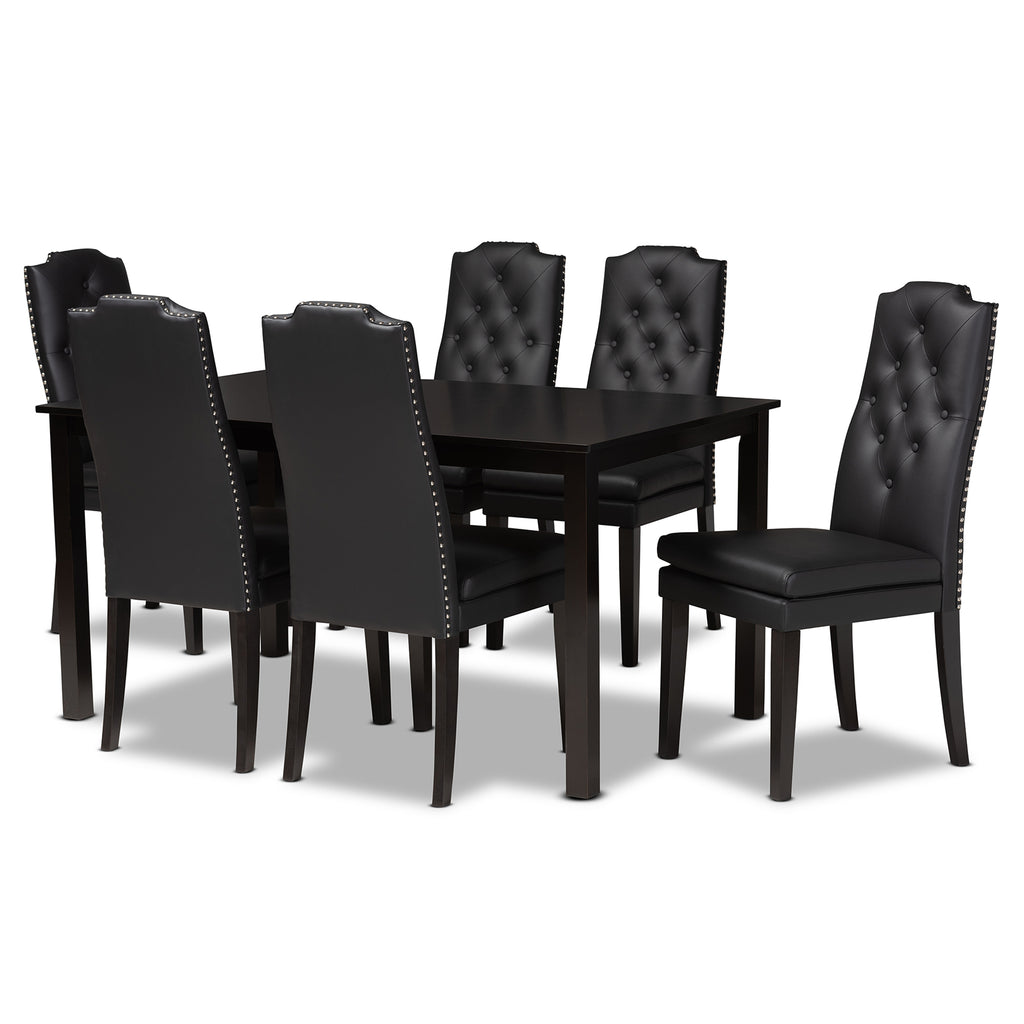 Transform every meal into a luxurious occasion with the stunning Dylin dining set. Made in Malaysia, this dining set includes six chairs and one table constructed from dark brown finished wood. Each chair is upholstered in quality faux leather for smooth comfort, while button tufting on the backrest lends a graceful touch. Requiring assembly, the Dylin utilizes a large, rectangular tabletop that comfortably seats six. Silver finished metal nailheads outline the chairs with dazzling style, making the Dylin dining set a magnificent addition to any dining space.