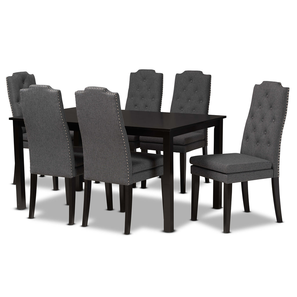 Transform every meal into a luxurious occasion with the stunning Dylin dining set. Made in Malaysia, this dining set includes six chairs and one table constructed from dark brown finished wood. Each chair is upholstered in smooth fabric for superb comfort while button tufting on the backrest lends a graceful touch. Requiring assembly, the Dylin utilizes a large, rectangular tabletop that comfortably seats six. Silver finished metal nailheads outline the chairs with dazzling style, making the Dylin dining set a magnificent addition to any dining space.