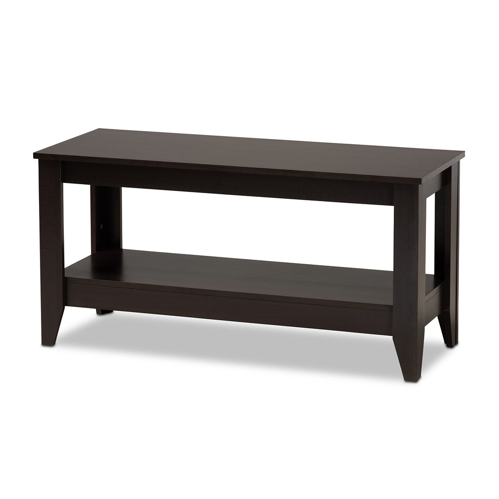 The clean, streamlined design of the Elada coffee table makes it an easy addition to any living room. This wood table features a spacious tabletop, perfect for a potted plant and a cup or two or espresso. A lower shelf provides space to display books, magazines, and more. Its dark wenge brown finish and tapered legs give the table an elegant, modern feel. The Elada coffee table is made in Malaysia and requires assembly.