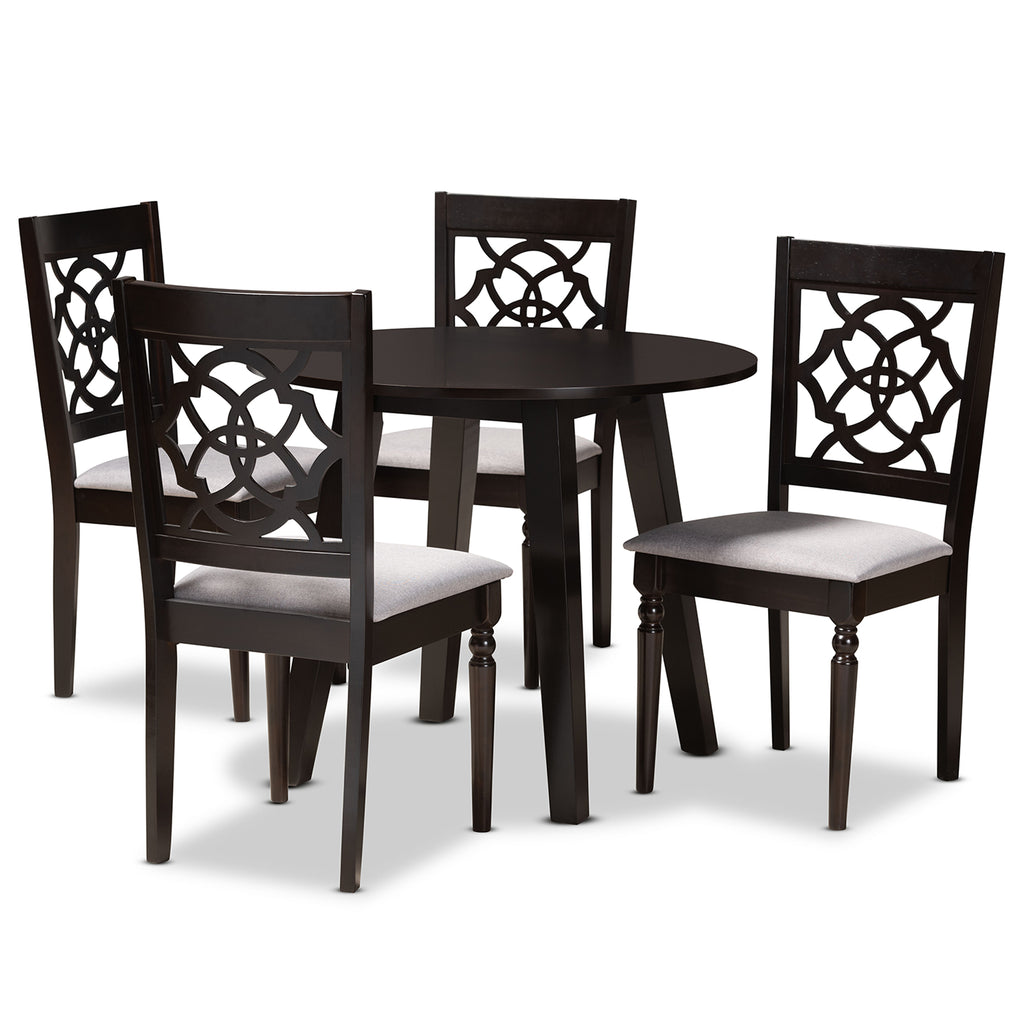 Elegant design marries quality craftsmanship in the Eliza dining set. Made in Malaysia, this wooden set includes one table and four chairs, each upholstered in a light fabric that complements the dark brown wood finish. Designed with both comfort and style in mind, each chair features a plush foam-padded seat, as well as a striking cut-out design on its back. The round tabletop is supported by splayed legs, creating a stylish profile from any angle. Requiring assembly, the Eliza dining set elevates any dining experience.