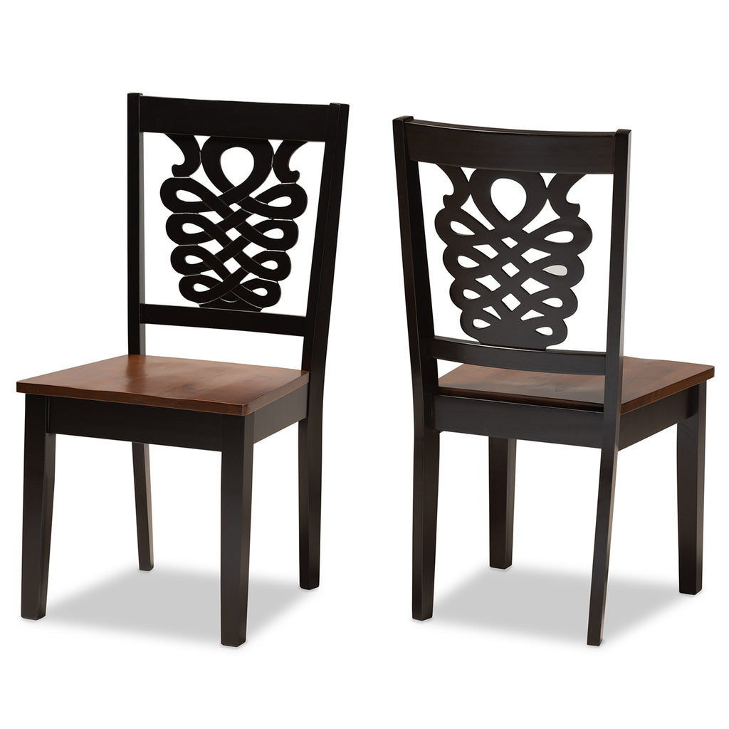 Imbue your dining space with the elegance of the finely crafted Gervais dining chair. Made in Malaysia, the Gervais is comprised of a sturdy wood frame showcasing a rich dark brown finish. The seat is finished in a distinctive walnut brown hue and is scooped for a more casual and comfortable dining experience. Requiring assembly, the backrest showcases a striking geometric design for added visual appeal. Straight legs add a touch of sleek, contemporary style, making the Gervais dining chair an excellent addition to the modern home.