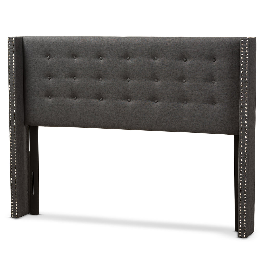 Exhibit luxury looks in your bedroom with the focal point of the lovely Ginaro dark grey fabric upholstered winged headboard. Constructed of solid rubberwood and plywood for strength and sturdiness, the Ginaro features button-tufted design in diamond shape and winged headboard with silver nail heads trims for luxury look in your bedroom. For extra comfort and an up-to-date look, the Gina is upholstered with dark grey polyester fabric over the padded foam for softness and shape that's comfortable to lean against. Assembly required, this modern and contemporary queen size headboard is made in Malaysia.