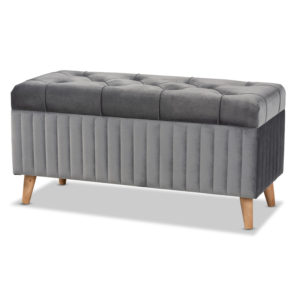 Give your space a modern update with the elegant design of the Hanley ottoman. Made in China, the Hanley features a sturdy wood frame padded with foam and upholstered in luscious velvet fabric. Elegant channel tufting on the sides and a button tufted cushion create a visually striking display from any angle. Requiring assembly, the top of the Hanley opens to reveal plentiful storage space for extra blankets and pillows. Angled wood legs complete the look, making the Hanley ottoman a remarkable addition to the modern home.