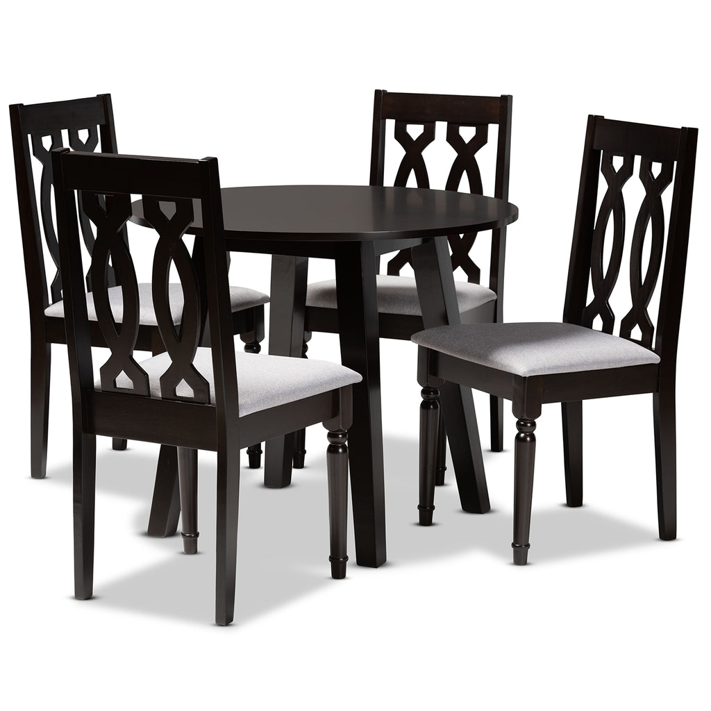 A unique balance of contemporary design and comfort defines the Imogen dining set. Made in Malaysia, the Imogen is constructed from sturdy wood and includes four chairs and one circular table. Plush foam-padded seats upholstered in grey fabric provide exquisite comfort while complementing the darker tones of the wood. Requiring assembly, the cut-out design of the dining chairs allow light to flow more freely throughout the room, giving any space a more open feel. The striking design of the Imogen dining set makes it an excellent addition to enhance any dining space.