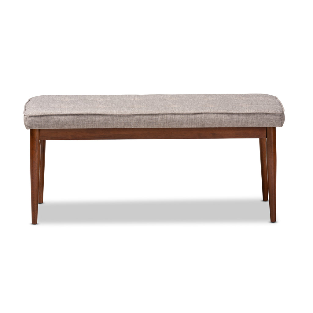 Transform your dining room with the elegance and comfort of the Itami dining bench. Constructed from solid rubberwood, the Itami showcases a stunning medium oak finish that complements the grey fabric upholstered seat. The seat features button tufting and piping trim for a touch of refinement. Mid-century modern design inspiration is evident in the low profile and angled, tapered legs. This versatile piece works well as seating at a dining table, or can be used as an accent piece in the entryway. The Itami bench is made in Malaysia and requires assembly.
