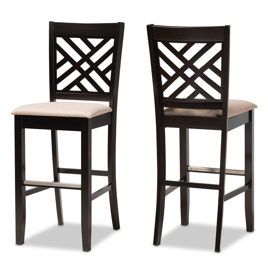Superb comfort outfitted in contemporary style distinguishes the Jason bar stool. Made in Malaysia, the Jason is crafted from wood in a traditional square frame. The bar stool is fitted with a foam-padded seat underneath a smooth layer of fabric and features a sleek cut-out design on its back. This piece requires assembly and is finished in a rich espresso brown that complements the lighter tones of the fabric. Sturdy silver metal is fitted on the front footrest, making the Jason bar stool well suited for both commercial and residential settings.