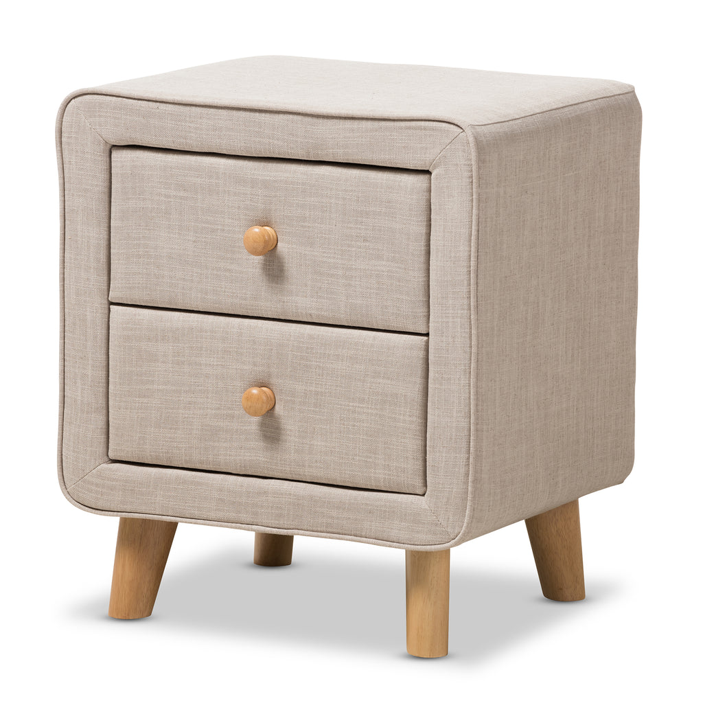 Featuring mid-century design, the Jonesy fabric upholstered 2-drawer nightstand perfectly complements the Jonesy fabric upholstered platform bed. Luxuriously upholstery as its bed counterpart, this stylish nightstand adds a modern and minimalist vibe to your room. Constructed of hardwood and plywood frame, the Jonesy is upholstered in beige mixed-linen fabric for every day's use. This gorgeous nightstand features two easy-sliding drawers with wooden knobs in natural finishing for easy access. The splayed legs, angularly shaped complement the nightstand for retro vibes. The drawers are adequately sized to store bedside essentials and other knick-knacks for a streamlined, clutter-free room. Combining fine exquisite materials and excellent craftsmanship, this nightstand presents a great investment for your bedroom. Made in Malaysia, the nightstand requires minor assembly.