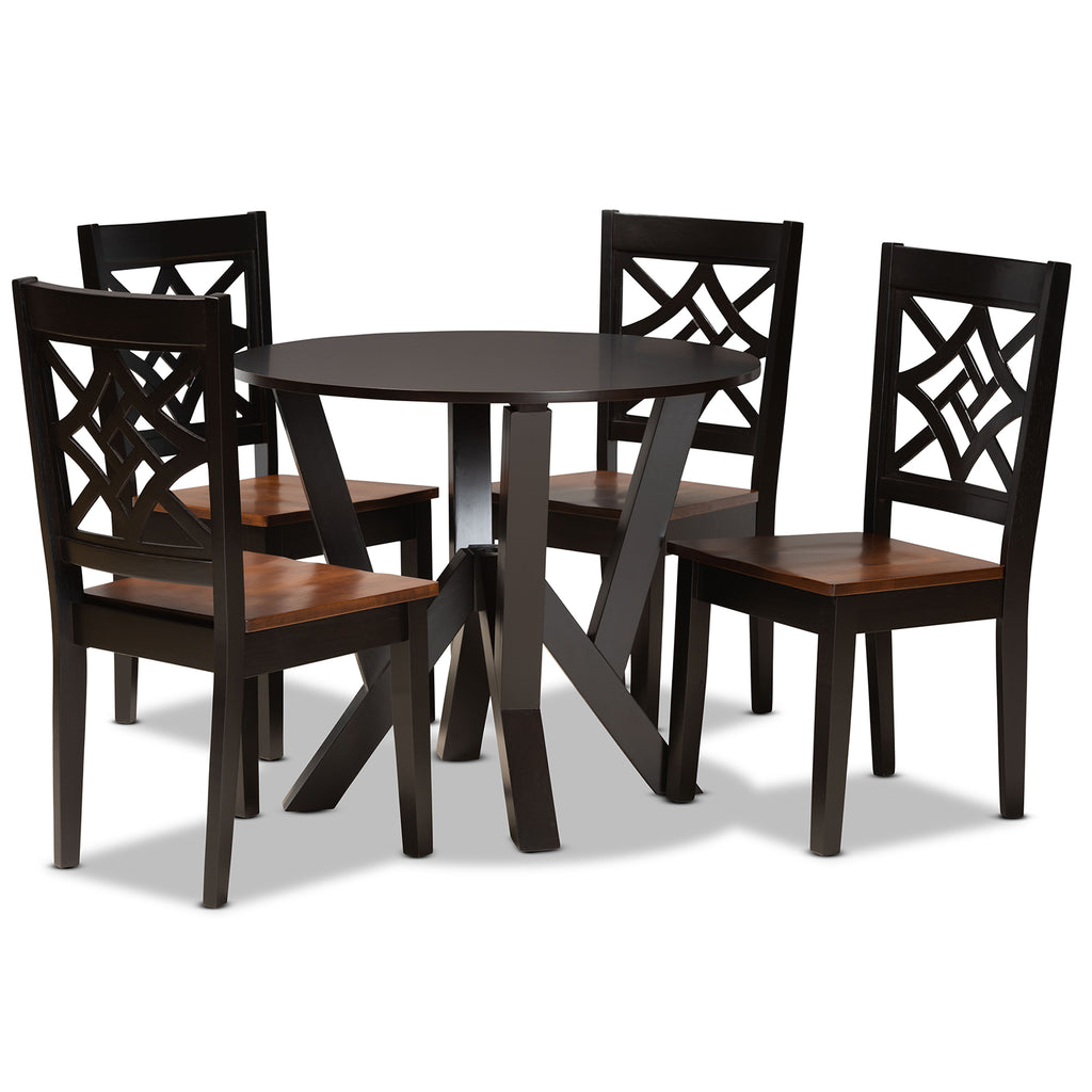 Add crisp, contemporary design to your dining space with the visually striking Kaila dining set. Made in Malaysia, this wooden set includes four dining chairs and one dining table showcasing a distinctive two-tone dark brown and walnut brown finish. Each chair features a unique, geometric cut out design for added visual appeal, while a scoop seat lends casual comfort. Requiring assembly, the circular tabletop provides ample elbow room for each member of the table. Perfect for both casual and formal dining, the Kaila dining set is an excellent addition to the modern home.