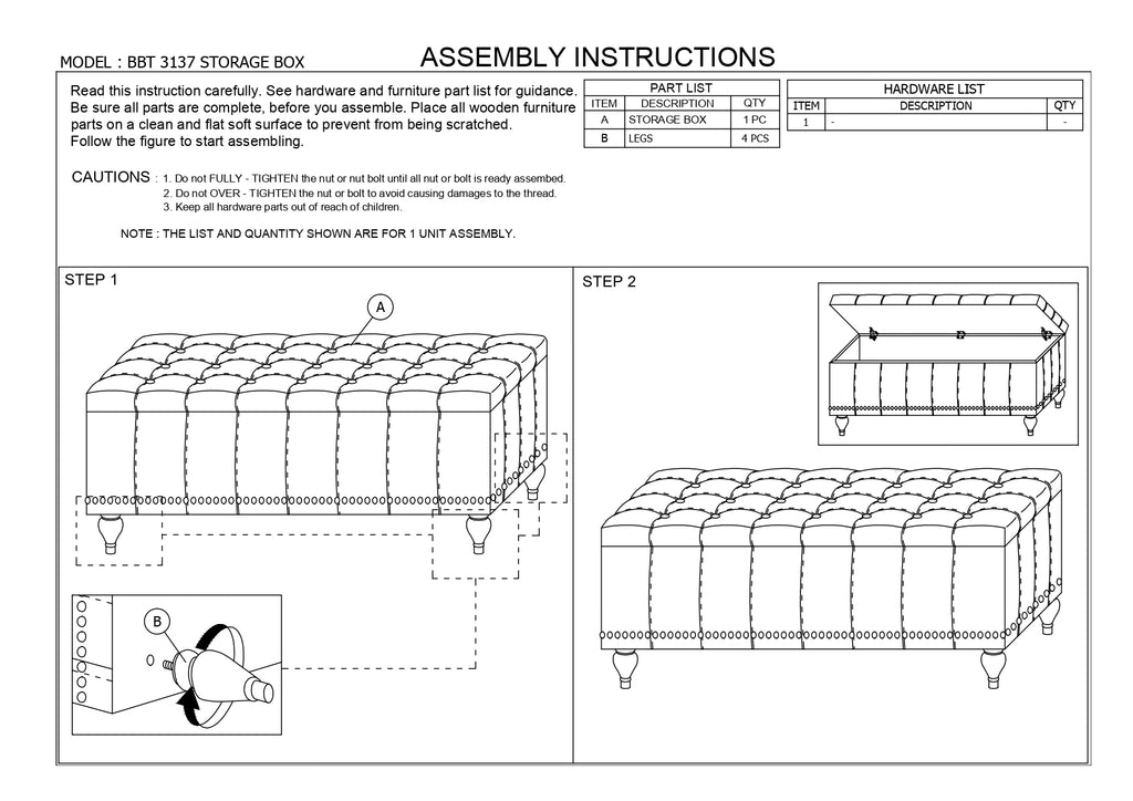Whether paired with upholstered bed as a bed end bench or simply on its own, this modern classic button-upholstered storage ottoman offers classic and smart interiors styling with practical internal storage that will work in any room. Add an on-trend neutral accent to a simple white room, the Kaylee storage ottoman bench is upholstered in polyester fabric available in your choice of beige, greyish beige, dark grey or light blue color for a neutral or statement look. Constructed of solid rubberwood frame and feet, the Kaylee is built to last. The ottoman box opens up to reveal internal storage for blankets and bed linen. Softly padded, the top of the lid features button-tufting with grid lines while the sides are trim with silver nail heads for a modern look. For refined elegance, the detailed stitching on all sides and the classic feet complete the look. Made in Malaysia, the Kaylee storage ottoman bench requires minor legs assembly