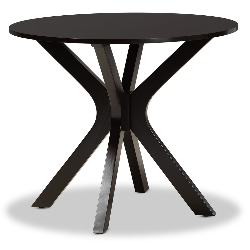 Sleek curves and a rich finish define the Kenji dining table. Made in Malaysia, the Kenji is built from sturdy wood and comfortably seats up to four. An espresso brown finish and round tabletop give the table a clean, contemporary look while also providing ample elbow room for each member of the table. Splayed legs form a unique sculptural base, creating a chic profile from any angle. Requiring assembly, the Kenji dining table is well suited for both casual and formal dining.