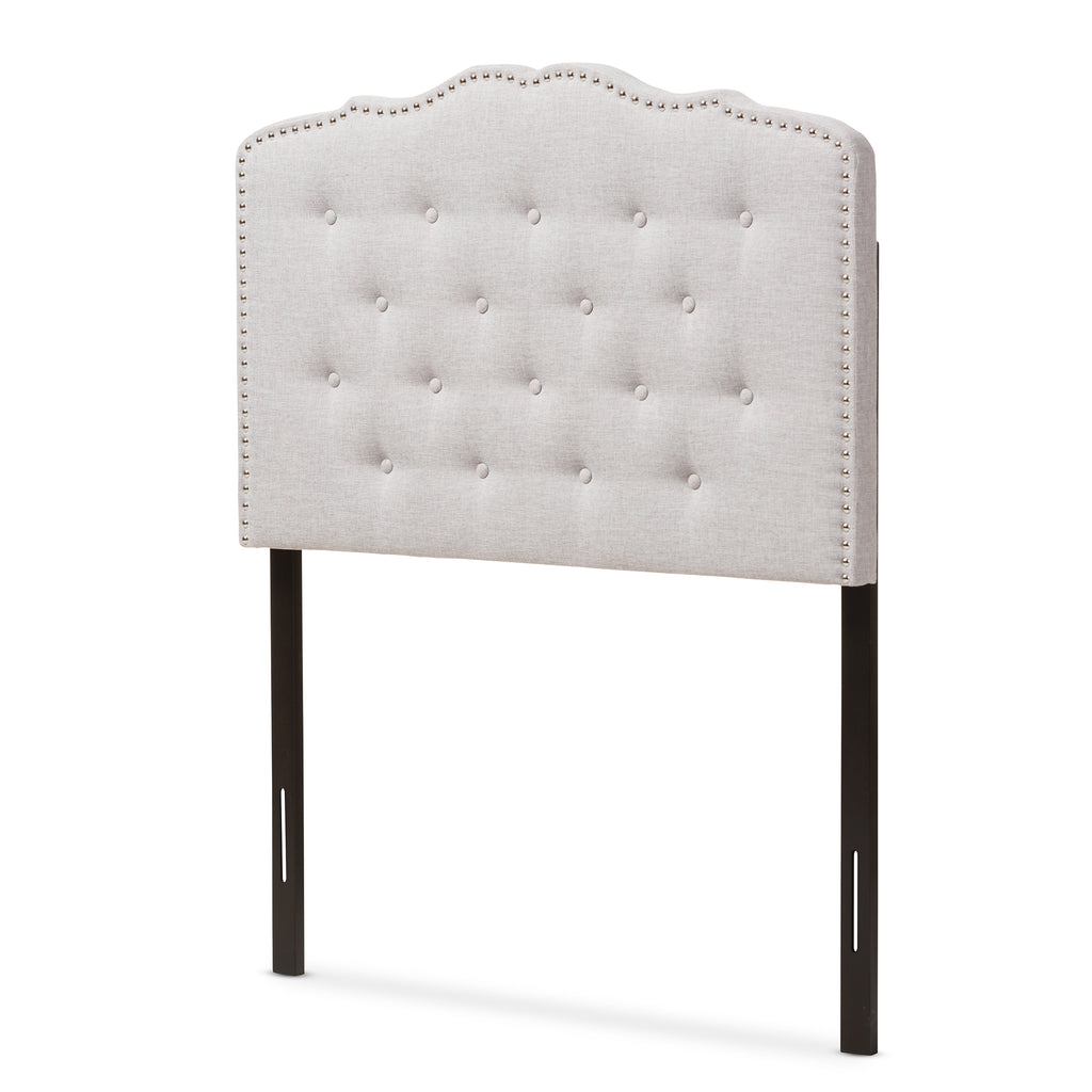 Classic finishes and an elegant curved shape make the Lucy fabric upholstered headboard the perfect centerpiece in your guest room or bedroom. Constructed of solid rubberwood frame, the Lucy twin size headboard is upholstered in greyish beige polyester fabric that is durable. Featuring curved shape with button-tufted design for a classic look, the Lucy is glamorously trimmed with silver nail heads for a more sophisticated look. The headboard is supported sturdily by solid wood posts with 5-adjustable pre-drilled holes attached to the headboard and 2-adjustable holes to configure the height of your bed frame. Traditional adjustable metal bed frame such as Leggett and Platt bed frame will work well with the headboard. Cushioned headboard offers softness and shape, providing a comfortable leaning space while you sit up. Made in Malaysia, the headboard requires assembly.