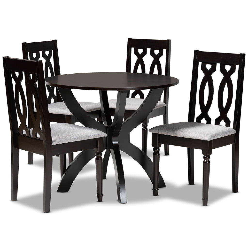 Artistic design meets modern comfort with the Mona dining set. Made in Malaysia, the Mona is constructed from sturdy wood and includes four chairs and one circular table. Plush foam-padded seats upholstered in grey fabric provide exquisite comfort while complementing the darker tones of the wood. Requiring assembly, the cut-out design of the dining chairs allow light to flow more freely throughout the room, giving any space a more open feel. The sculpture-like design of the Mona dining set makes it an eye-catching addition to enhance any home.