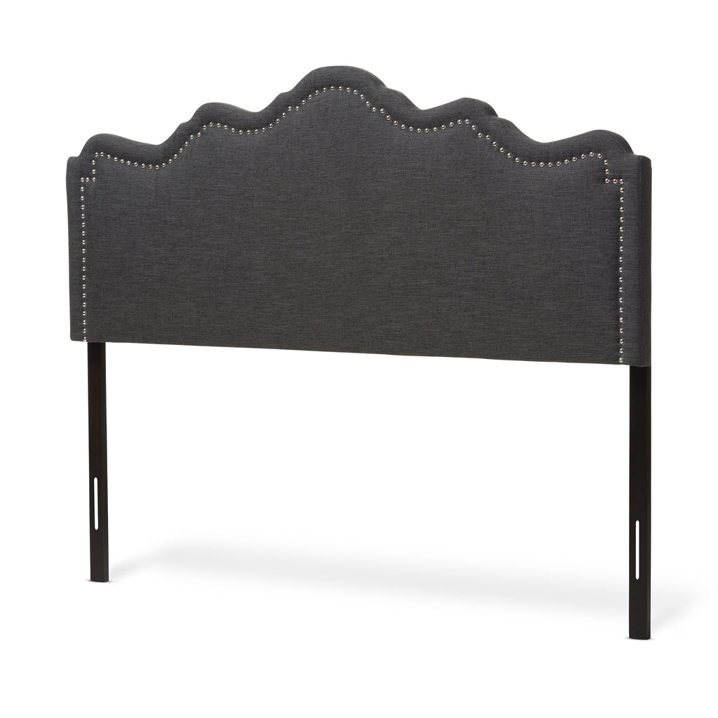 Complete your bedroom interior with the Nadeen fabric upholstered headboard. Constructed of solid rubberwood and MDF, the Nadeen king size headboard is upholstered in durable dark grey polyester fabric. Featuring curvaceous design with silver nail heads trim for a glamour look, the Nadeen offers a touch of modern sophistication. Mounting wood post is made from quality rubberwood for stability and strength. The wood posts, featuring 5-level adjustable to the headboard and 2-level adjustable to the bed frame provide more flexibility for you to configure the height of your bed. Traditional adjustable metal bed frame such as Leggett and Platt bed frame will work well with the headboard. Cushioned headboard provides softness and shape, allowing you to rest comfortably. Made in Malaysia, the Nadeen requires assembly.