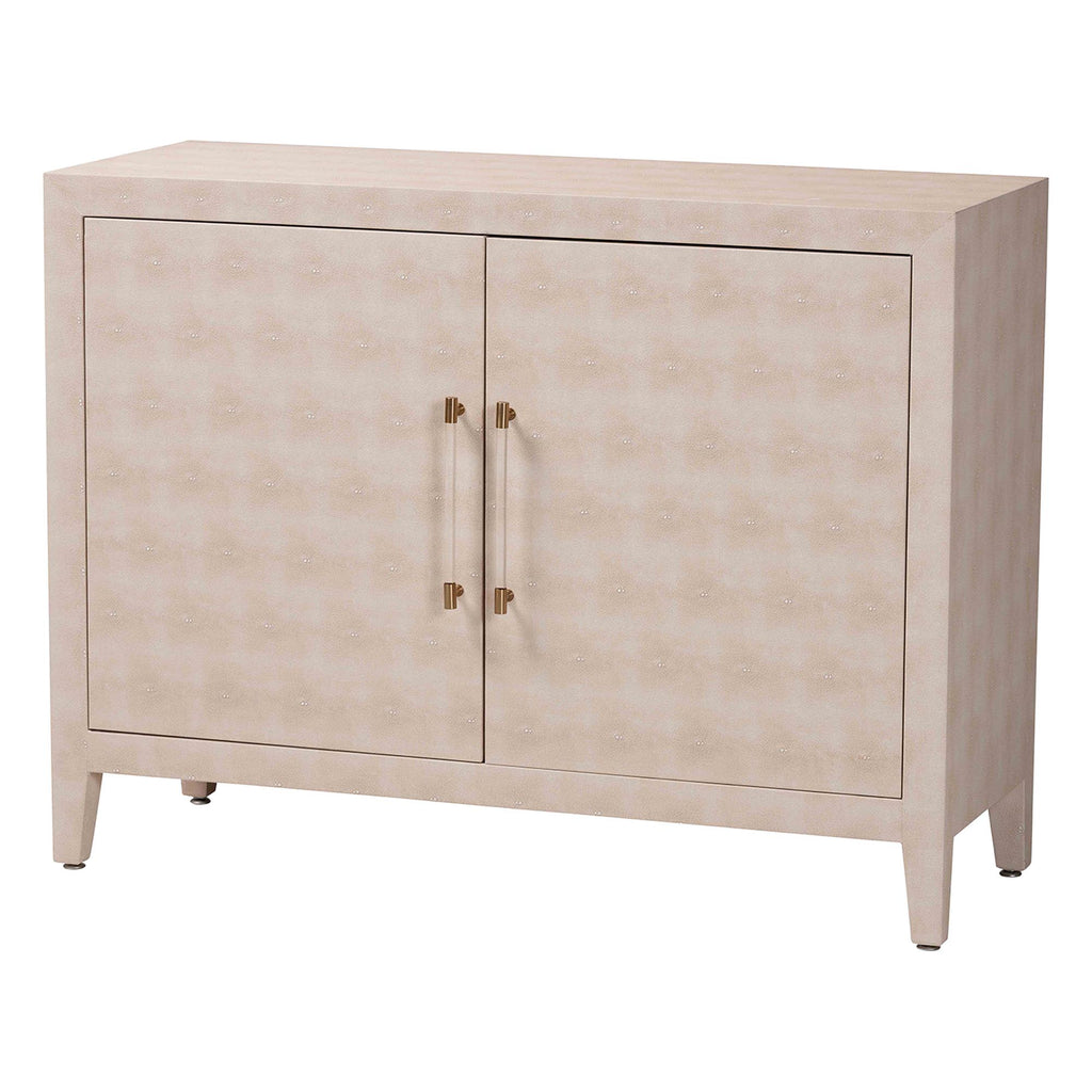 The Nira storage cabinet exudes avantgarde character while bringing versatility to any layout. Adeptly crafted in China, this chic piece consists of a sturdy wood frame wrapped in faux shagreen for a captivating display rich with the unique granular texture of the material. Four interior shelves offer space to organize and declutter a variety of layouts while reserving the tabletop as a fantastic display area. The Nira will arrive fully assembled and is fitted with graceful handles that brilliantly stand out against the shagreen. Tapered legs complete the graceful look, making the Nira storage cabinet a remarkable household fixture.
