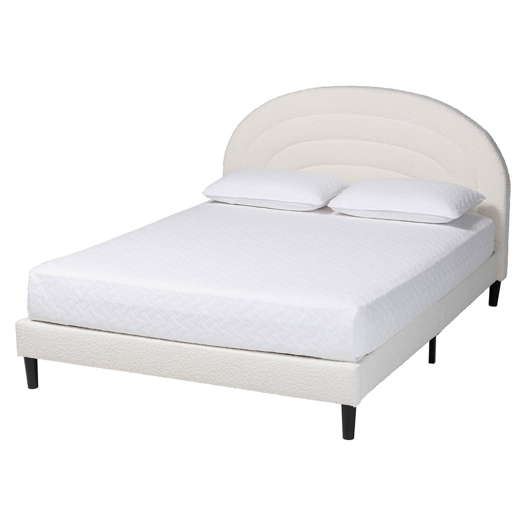 Center your bedroom around the comfort and beauty of the stunning Pelagia platform bed. Made in Malaysia, this contemporary piece consists of a sturdy wood frame padded with plush foam and upholstered in sumptuous boucle fabric. Its enchanting headboard features line-tufted detailing in the style of a gorgeous rainbow for an exuberant bedroom backdrop. The Pelagia requires assembly and utilizes wood slats for mattress support, eliminating the need for a box spring. Efficiently organizing all hardware within the broad headboard, the Pelagia platform bed is as practical as it is beautiful.