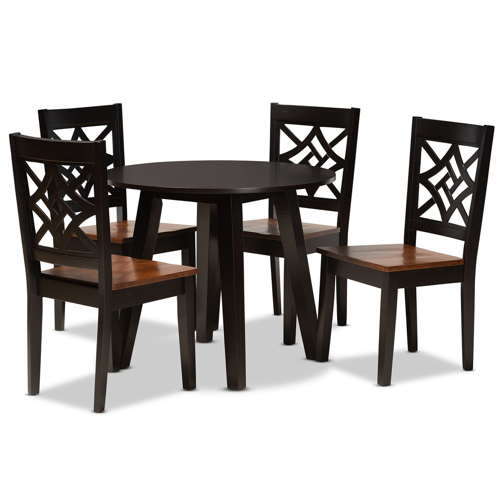 Add crisp, contemporary design to your dining space with the visually striking Rava dining set. Made in Malaysia, this wooden set includes four dining chairs and one dining table showcasing a distinctive two-tone dark brown and walnut brown finish. Each chair features a unique, geometric cut out design for added visual appeal, while a scoop seat lends casual comfort. Requiring assembly, the circular tabletop provides ample elbow room for each member of the table. Perfect for both casual and formal dining, the Rava dining set is an excellent addition to the modern home.