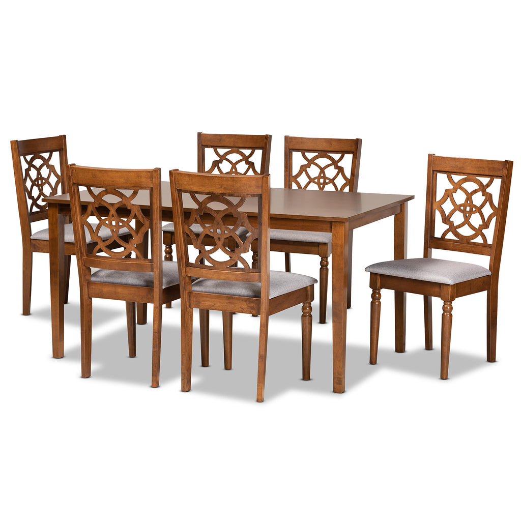 Give your dining space a chic, contemporary ambiance with the Renaud dining set. Made in Malaysia, this set includes six dining chairs and one table constructed from sturdy wood finished in a warm walnut brown. Each chair is fitted with a foam padded seat and upholstered in a smooth grey fabric. A unique cut-out design on the back of each chair allows light to flow through, creating a more open feel in tight spaces. Requiring assembly, the large, rectangular tabletop provides plenty of elbow room for each member of the table. Add style and versatility to any dining space with the Renaud dining set.