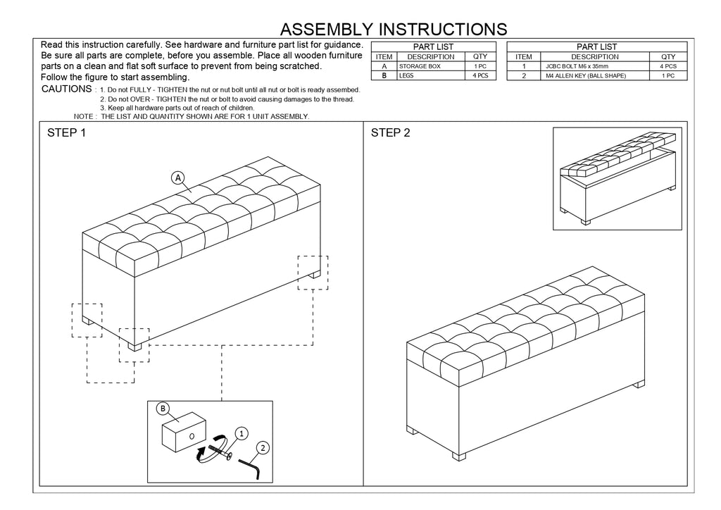 Perfect as a bed end bench for your bedroom or as an accent piece in your living space, the Roanoke storage ottoman bench combines handy seating and storage in a stylish way. Constructed of solid rubberwood frame, the storage ottoman bench features cushioned seat upholstered in quality polyester blend fabric that's durable and stain-resistant, available in your choice of beige, greyish beige, dark grey or light blue color for a neutral or statement look. Featuring grid-tufting design, the hinged top reveals spacious storage trunk while the black solid wood legs create a strong foundation and an elegant look. Made in Malaysia, the Roanoke storage ottoman requires minor legs assembly.