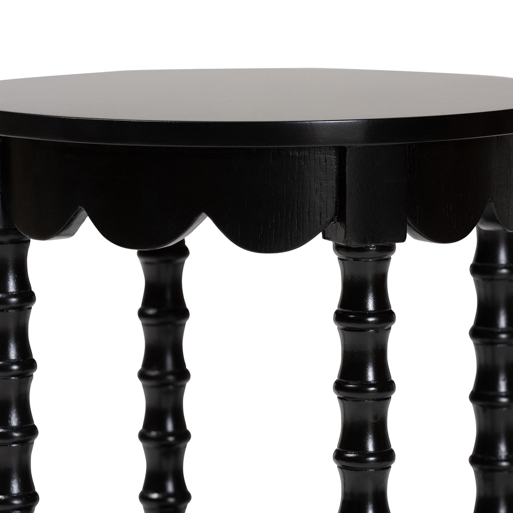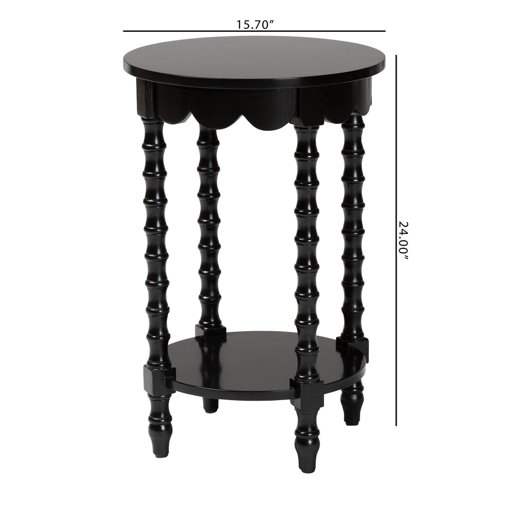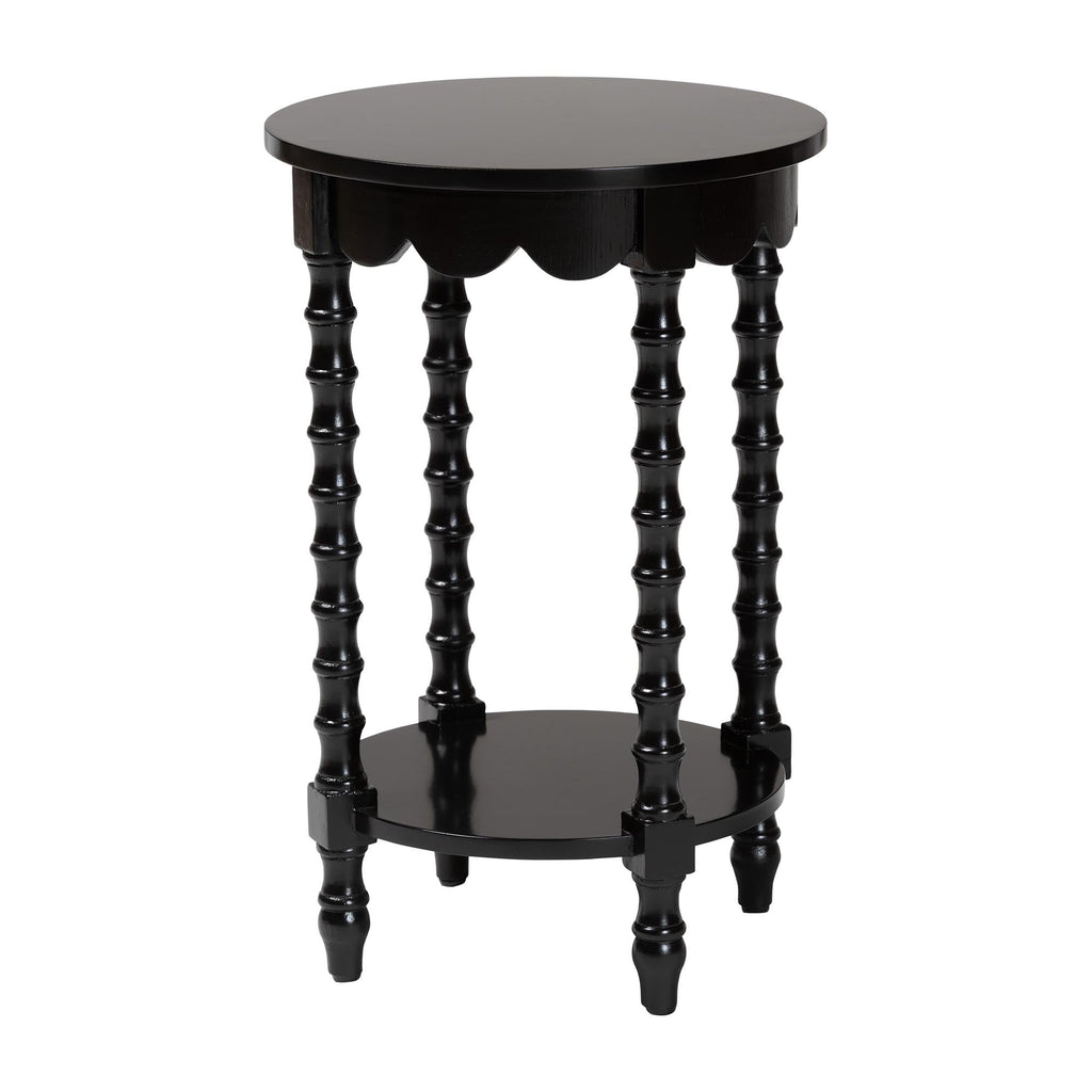 Rouse the mood of your space with the eclectic poise of the Sally end table. , this mid-century inspired piece is crafted from sturdy wood. The bamboo-inspired texture of the legs invigorates the piece with vibrant geometry for a remarkable display in any scenario. The Sally will arrive fully assembled and features a round tabletop bordered by a scalloped trim for an added touch of serene flair. Fitted with an open shelf for exhibiting decor, the Sally end table is sure to refresh the feel of any setting.