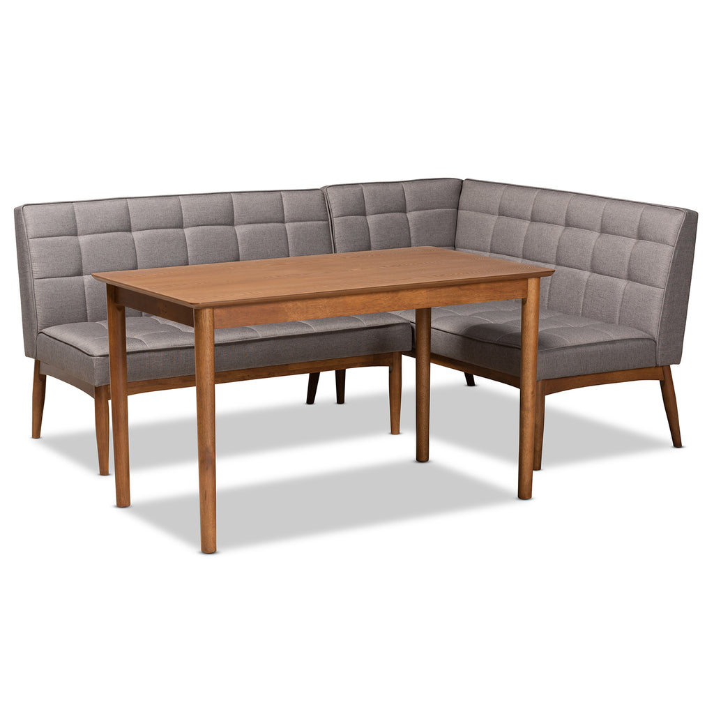 Smooth seats and casual style abound with the Sanford dining nook set. Made in Malaysia, this set includes one armless bench, one corner bench, and one table, each comprised of walnut brown finished wood. The benches are padded with soft foam and upholstered in grey fabric for superb comfort with every meal. Requiring assembly, the broad, rectangular tabletop ensures ample elbow room for each member at the table. Angled, tapered legs complete the look. Ideal for smaller dining rooms and nooks, the Sanford dining nook set rejuvenates any space.