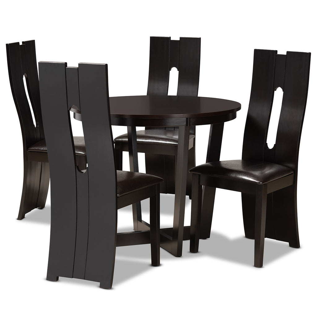 Exquisite attention to detail makes the Sorley dining set a distinctive addition to any space. Made in Malaysia, this wooden set includes one table and four chairs, each upholstered in a sleek dark brown faux leather that matches the dark brown wood finish. Designed with both comfort and style in mind, each chair features a plush foam-padded seat, as well as a striking cut-out design on its back. The round tabletop is supported by an intersecting base, creating a chic, sculptural effect. Requiring assembly, the Sorley dining set is well suited for both casual and formal dining.