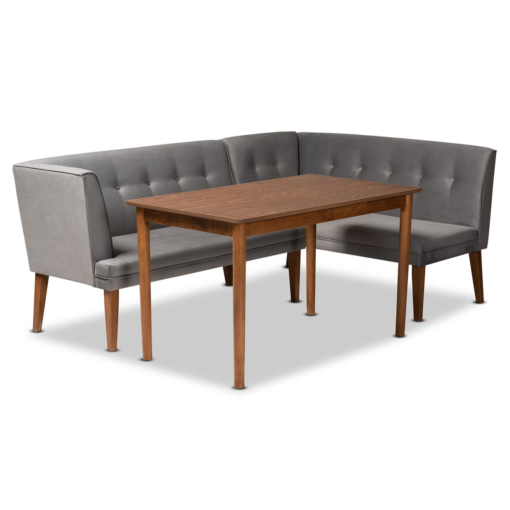 Delight in casual conversation at weekend brunches with the Stewart dining nook set. Made in Malaysia, this set includes two corner benches and one dining table. Each piece is constructed from sturdy wood, while the benches feature plush layers of foam underneath sumptuous velvet fabric for superb comfort. The Stewart requires assembly and utilizes a rectangular tabletop to ensure ample space for each member of the table. Perfect for smaller dining rooms and nooks, the Stewart dining nook set redefines any dining experience.