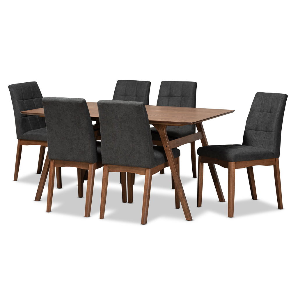 Baxton Studio Tara Mid-Century Modern Dark Grey Fabric Upholstered and Walnut Brown Finished Wood 7-Piece Dining Set