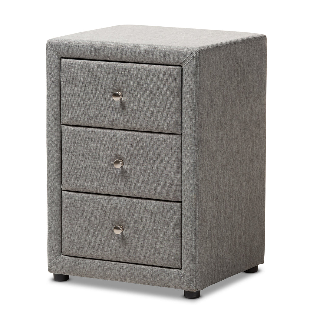 The Tessa 3-Drawer nightstand exemplifies how minimalism can be chic and sophisticated. The modern and contemporary-inspired design emphasizes clean lines and smooth surfaces. The Tessa features a foam-padded plywood and hardwood frame with all-over grey fabric upholstery. The chrome-finished drawer knobs provide a contrast to the upholstery as an additional style element. The Tessa also features three pull-out drawers on gliders, giving you more storage options at your bedside. The simplistic design makes this nightstand easy to coordinate with the existing decor in your bed room or guest room. Made in Malaysia, the Tessa requires assembly.
